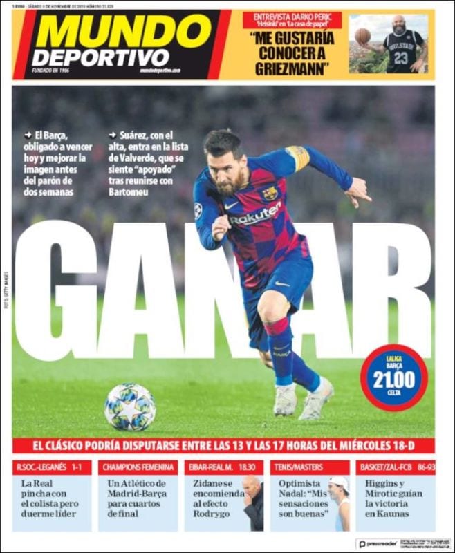 “Ganar” sobre la silueta de un Messi concentrado en lo que ha hecho su equipo en los últimos partidos: perseguir la pelota. La frase superior ha despertado nuestra atención: “Me gustaría conocer a Griezmann”. Por error creímos que podría haber sido pronunciada por Leo Messi a los cuatro meses de iniciada la temporada, pero si lo pensamos bien no es así, no porque corresponda a un personaje de la serie La casa de papel, sino porque el jugador argentino no parece tener ningún interés en conocer al francés que le acompaña en la delantera con aire ausente.