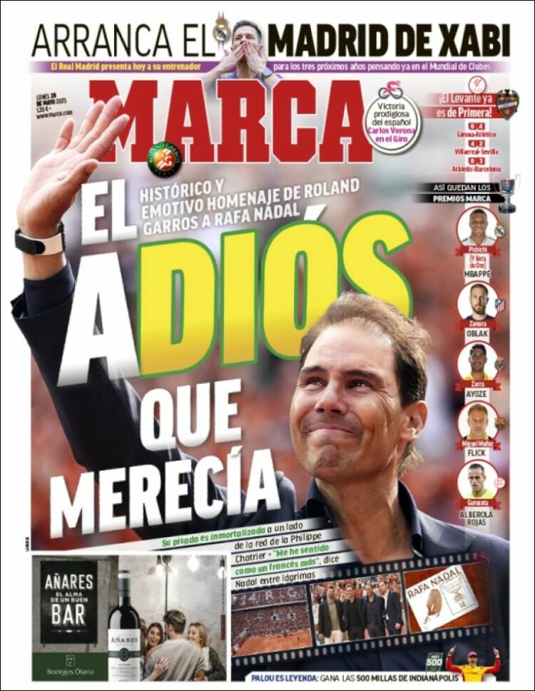 La prensa de la jornada da cuenta del Día Cero de la era Xabi, aunque su principal argumento sea, con toda justicia, el homenaje que Roland Garros tributó ayer a Rafa Nadal. Con inmenso gusto y emoción, como no podía ser menos, nos unimos a él.