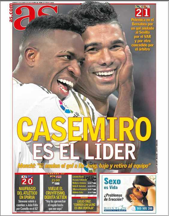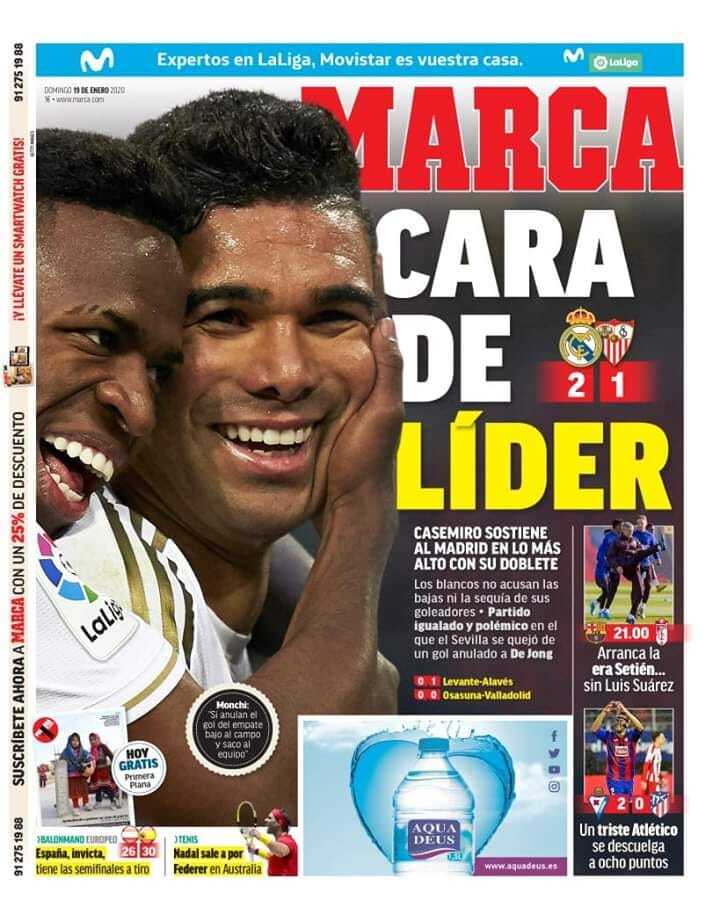 Misma foto, idénticos patrones en la Ouija Today. Sí, “Casemiro es el líder” en grande, pero colamos la “polémica en el Bernabéu” y bien visible dejamos caer el matonismo indignado de Monchi. La máquina del fango a pleno rendimiento, la victoria del Madrid queda deslegitimada. ¿Qué dirán en Barcelona de todo esto?