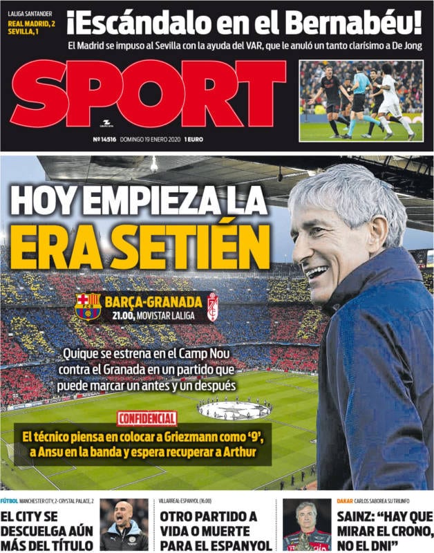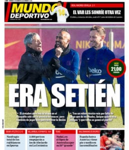 Menos mal que la victoria del Madrid es ya prehistoria, señores, volvamos a la pureza del deporte, al juego en sí. Como los grandes feladores mediáticos se han encargado de vender durante toda la semana (tal y como explicaba Pepe Kollins en este artículo), y como hoy mismo nos recuerda el diario Sport con tipografía de gran tamaño: “Hoy empieza la era Setién” o "Era Setién", a secas, de Mundo Deportivo, mostrando una imagen del vaquero haciendo feliz, incluso, a un jugador tan poco afín a su inmaculado estilo futbolístico, como Arturo Vidal.