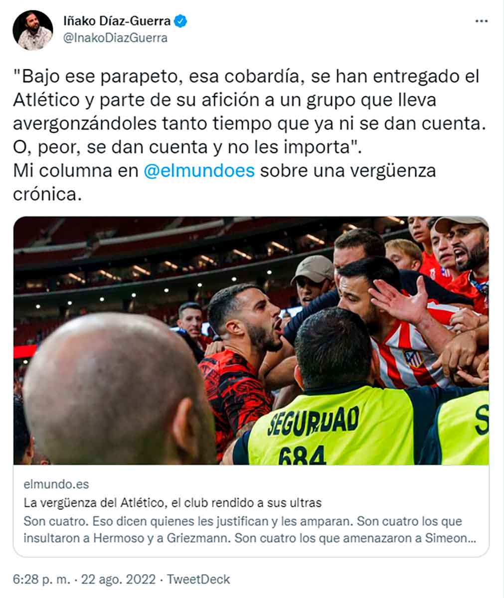 Miseria que es común en otros lugares como el Atlético de Madrid, es alarmante que siga habiendo seguidores, y personas en general, que justifiquen a los delincuentes neonazis del Frente Atlético. En este sentido, aplaudimos la valentía de Iñako Díaz-Guerra.