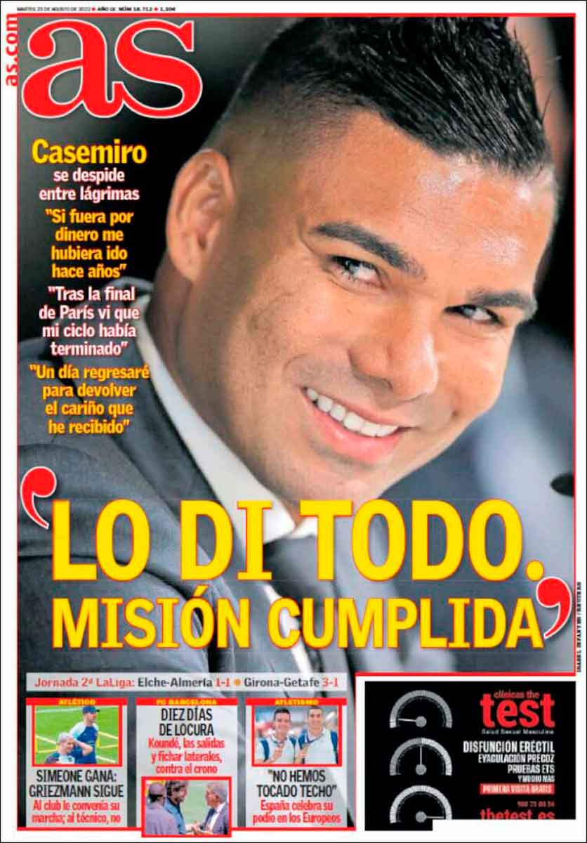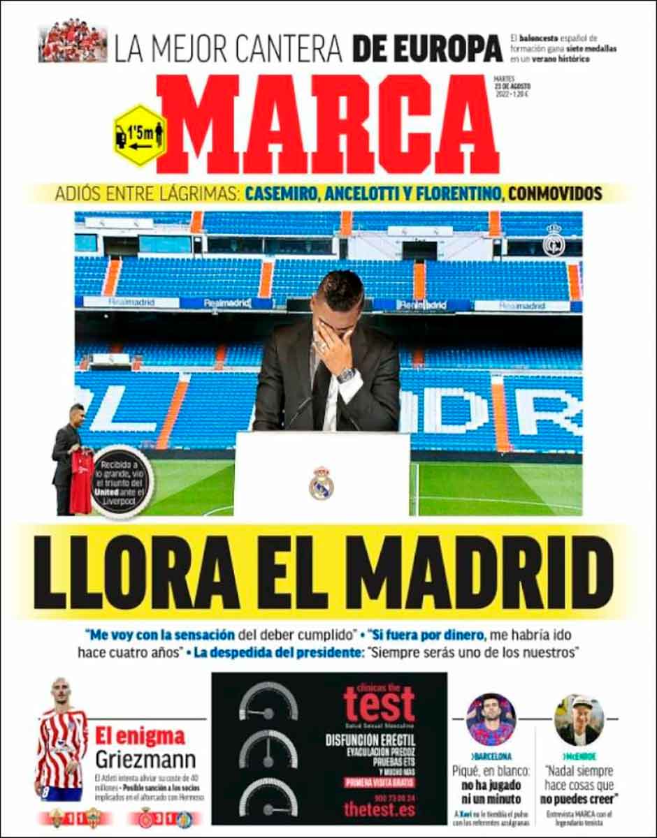 Casemiro también aseguró que no se iba por dinero, lo recoge As en su portada, que de haber sido así lo habría hecho hace al menos cuatro años. Que vaya a cobrar más en el Manchester United no es incompatible con esta afirmación, aunque David Oller afirmaba ayer que lo que realmente llevó a Case a tomar la decisión de cambiar de aires fue el miedo a defraudar al madridismo, por eso ha preferido irse en lo más alto, para no dar al futuro la opción de que ocurra. Casemiro lo llamó final de ciclo, y afirmó que lo sintió cuando terminó la final de París. Casemiro, historia ya hecha, enmendando la plana al himno de Jabois, como escribió ayer Jesús Bengoechea.