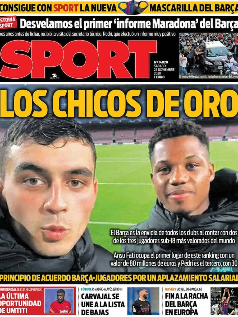 No sabemos cuál será la última cosa que los lectores de Sport verán posible. LOS CHICOS DE ORO suena un poco como Los chicos del coro, pero atención, la frase de oro de esta portada es esta: “El Barça es la envidia de todos los clubs al contar con dos de los tres jugadores sub-18 más valorados del mundo”. Repetimos: “El Barça es la envidia de todos los clubs al contar con dos de los tres jugadores sub-18 más valorados del mundo”. Estimados lectores de Sport (después de leer esto no podemos llamaros más que estimados): Estamos con vosotros. No podéis seguir permitiendo este trato vejatorio. El Barsa no puede ser la envidia de nada en este momento, estimados lectores de Sport. Ni siquiera por tener a Ansu y a Pedri (hazte mayor, Pedri, y ponte Pedro) en esa clasificación semiabsurda sacada con fórceps de un caletre trastornado que dice que el Barsa es la envidia ¡de todos los clubs! asomado al precipicio del concurso de acreedores, dirigido por una junta gestora que no puede pagar los salarios, sin crédito en ninguna entidad nacional e internacional y con una bomba argentina en su interior que puede estallar en cualquier momento haciéndolo todo pedazos.