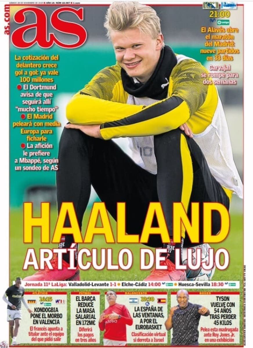 Miren lo de As, sin ir más lejos. Aparece Haaland como en la Súper Pop. Otros días son otras cosas variadas, más rijosas. Hoy es la Súper Pop. Pero lean, lean. Cualquiera diría que hay ahí a primera vista un perfil actualizado del noruego para fans y no es así. Les vamos a traducir. Las cuatro primeras líneas en amarillo significan: “A ver si os vais a creer, vikingos, que os lo vais a llevar barato como soléis hacer siempre”. Las siguientes cuatro, en blanco, quieren decir: “Vamos a tener culebrón para años y vosotros, vikingos, os vais a enterar”. Las terceras cuatro líneas, en amarillo: “Ni de broma lo conseguís, vikingos”. Y por último: “La afición le desea y no vais a poder satisfacerla. Ni aunque traigáis a Mbappé, porque el que mola ahora es Haaland”. Y por supuesto, el titular: HAALAND ES DEMASIADO LUJO PARA VOSOTROS, VIKINGOS.
