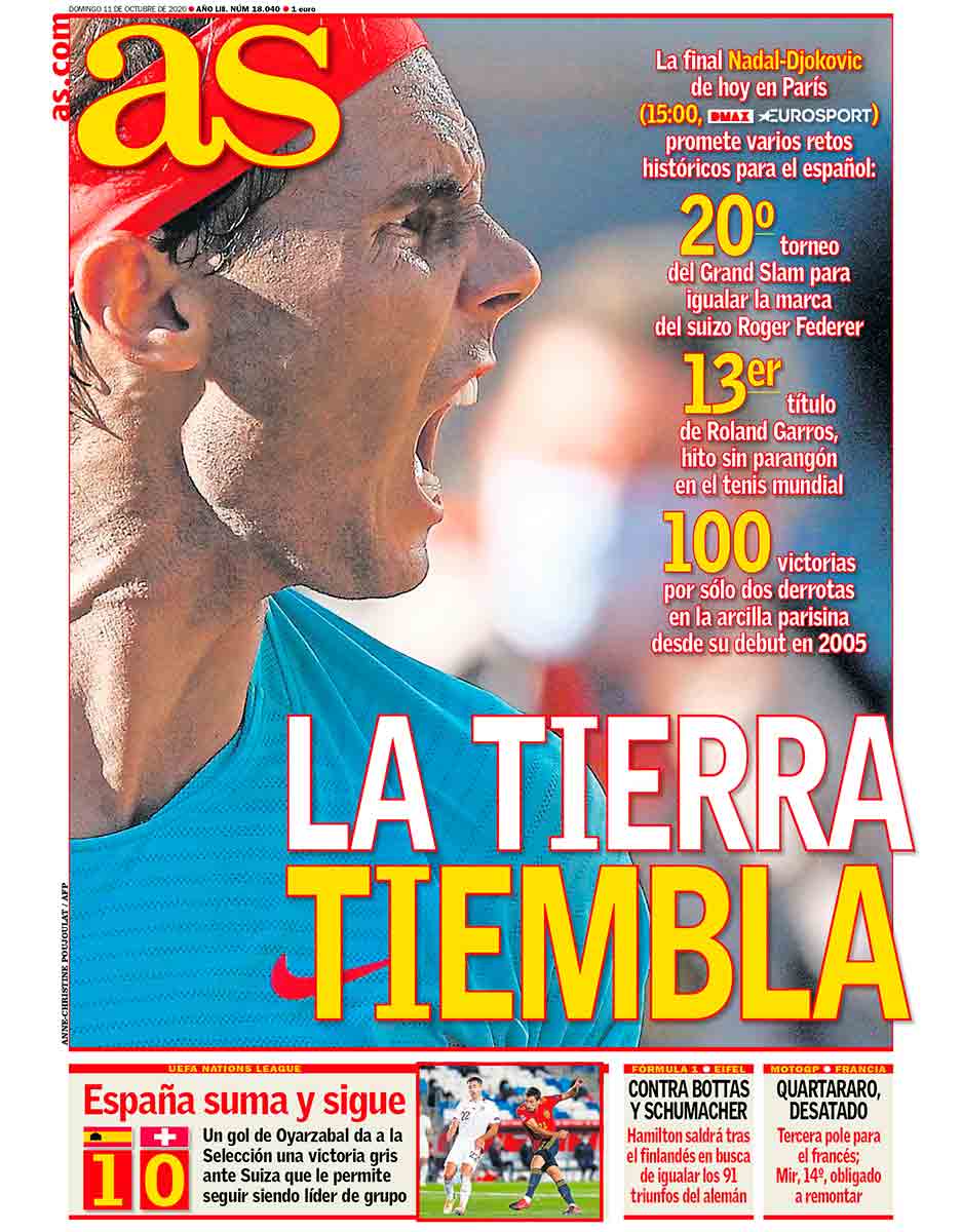 No es descabellado afirmar que la selección española atrae pocas pasiones. Anoche se impuso por un gol a cero a Suiza en un partido disputado en el Alfredo Di Stéfano con tanto público en las gradas como telespectadores en sus casas. En otros tiempos, habría sido impensable que un partido de la selección no ocupara la foto central y la noticia principal de la portada, pero ocurre en el diario As y en el fondo (y en la superficie) no nos extraña. «La Tierra tiembla» al paso firme de Nadal. Lo que está consiguiendo Rafa Nadal desde su debut en el mundo del tenis es salvaje, único, descomunal, acojonante… se nos acaban los adjetivos. Se nos acaba el propio vocabulario para definir lo que ha logrado ya en su carrera y lo que todavía puede mejorar.