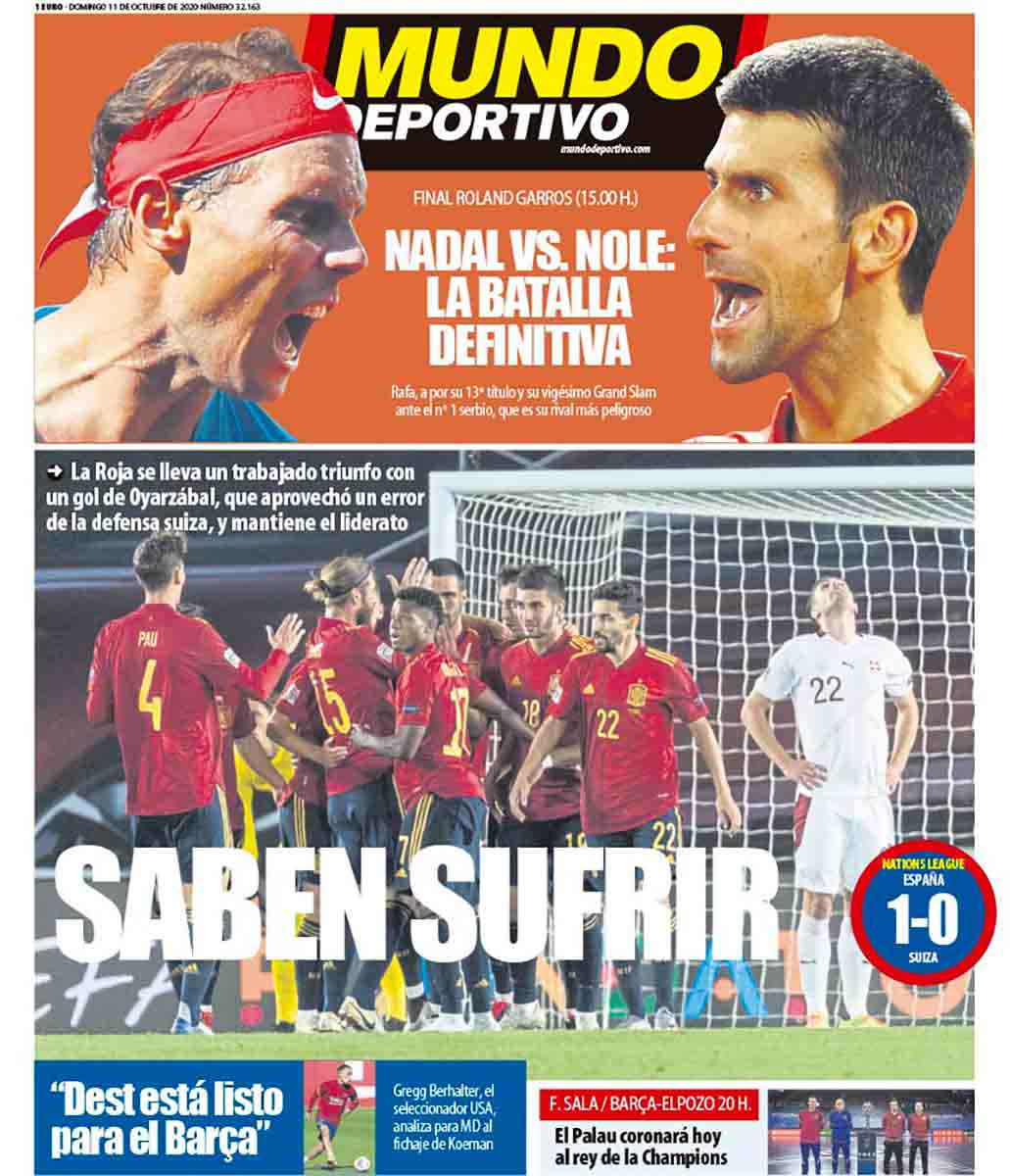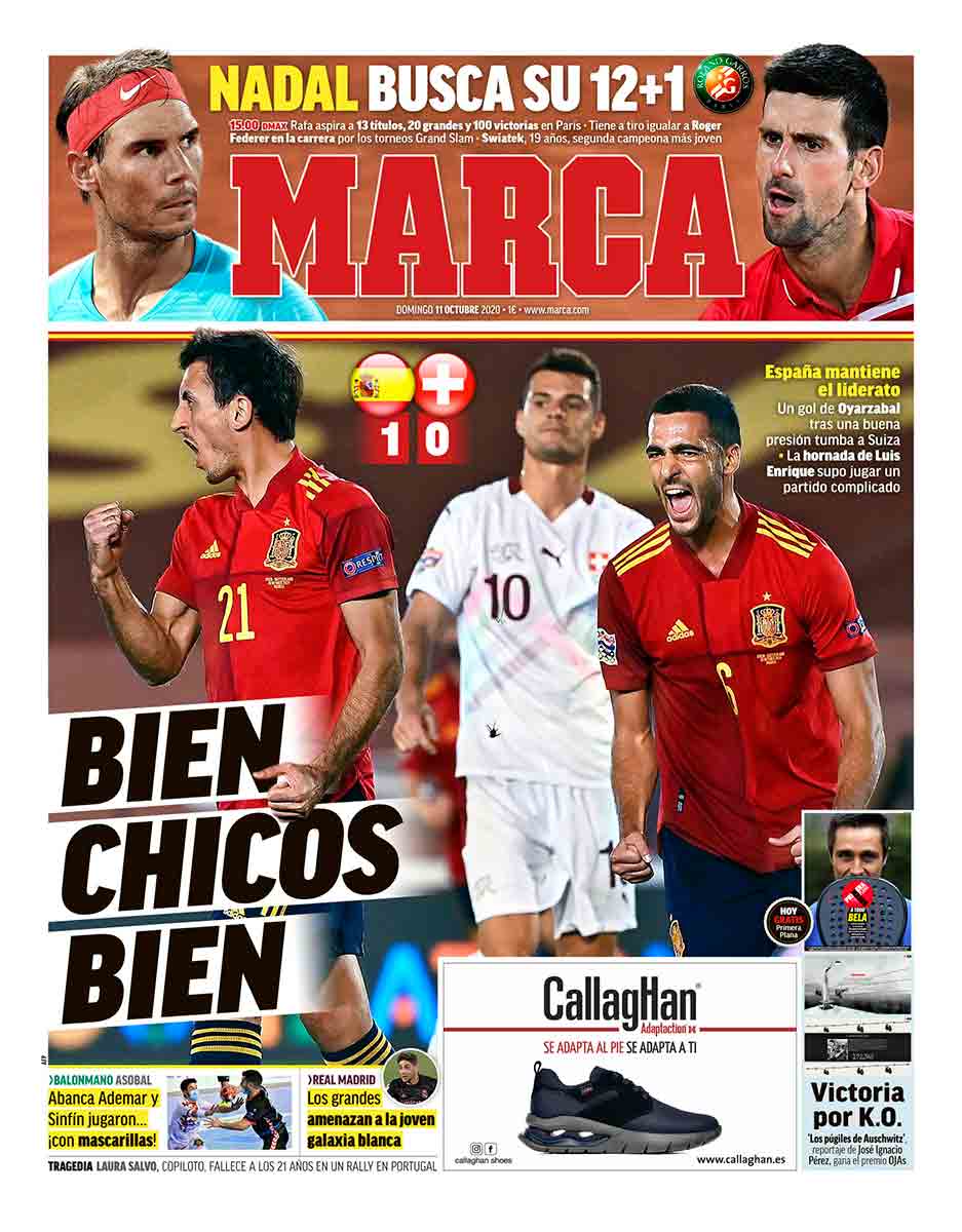 Como podrán comprobar los lectores, el parón de selecciones disminuye nuestras capacidades portanalistas y convierte este oficio en uno de los más complicados que existen junto al de sexador de pollos, el de oledor de axilas para perfumes o el de soldado de guardia en el palacio de Buckingham. Lo más destacable de la portada de Marca se encuentra en el faldón superior, en la mención acerca de la final entre nuestro Rafa Nadal y el serbio Novak Djokovic en busca del título 12+1 del manacorí sobre la arcilla parisina. Un número que le igualaría con Ángel Nieto en títulos mundiales y con el Real Madrid en trofeos de Champions. En caso de conseguirlo, lo de Rafa será una animalada más en su dilatada carrera de éxitos.