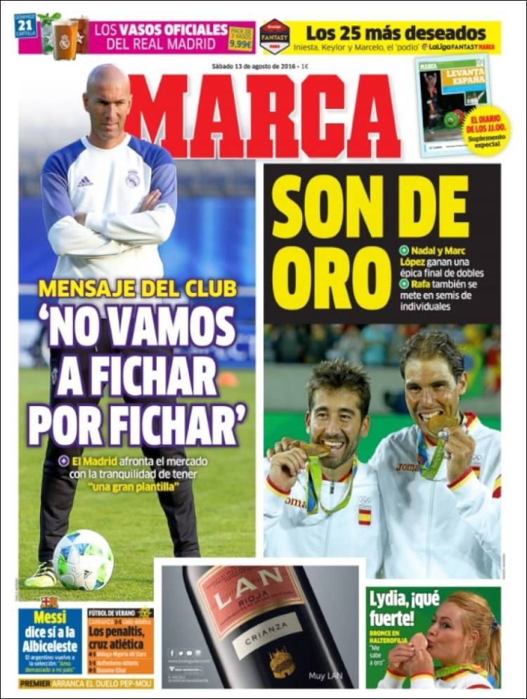De los cuatro medios aquí analizados, solo Marca llega a tiempo de poner en su portada la hazaña de Nadal y López, su hincar el diente a un formidable oro tras ganar a la rocosa pareja rumana en la noche brasileña. Sabemos desde hace tiempo no solo que Nadal es madridista, sino que de jugar el Madrid al tenis, jugaría como Rafa, con el "¡vamos!" como mantra, con el cuchillo entre los dientes, con la firme convicción de que el salto de calidad de la calidad lo da el arrojo, la fe y el "me vas a tener que matar para que pierda". Eso es sin duda parte de eso que llaman espíritu olímpico, algo en lo que, pese a no disputar jamás unas Olimpiadas, el Madrid se doctoró hace ya tiempo con las Copas de Europa como santo y seña.