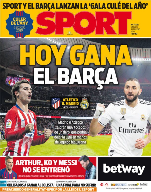 Buenos días. Ya lo habéis leído, amigos. El Barça ganará esta tarde en el Wanda, donde juegan Madrid y Atleti. Lo anuncia Sport, y nos alegra mucho que el rotativo barcelonés y filoculé se haya dado cuenta al fin de que el Barça gana siempre, hasta cuando no juega. Que jueguen otros para que ganen ellos: es la sublimación del juego con red y la protección institucional.