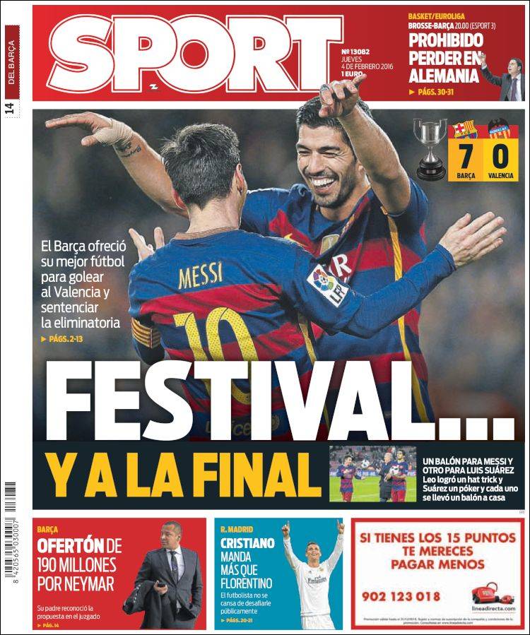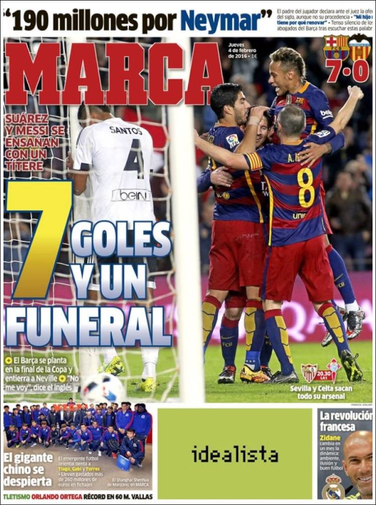 Pero atención. Queda en suspenso la teoría de la huelga antes planteada. Marca saca en su portada una foto distinta de la que figura en Sportivo, así que tenemos que deducir que hay mayor variedad de la anteriormente contemplada. ¿O no? Digamos que sí, pero en realidad no. "7 goles y un funeral", dice Marca para glosar con mayor originalidad que la prensa catalana el partido copero del Barcelona y ¿del Valencia? Recordamos aquella estupenda película que es Cuatro bodas y un funeral, así como la canción que dominaba en su banda sonora. Su título era Love is all around y comenzaba con un "I feel it in my fingers, I feel it in my toes" que ciertamente parecen cantar a trío las portadas vistas hasta ahora.