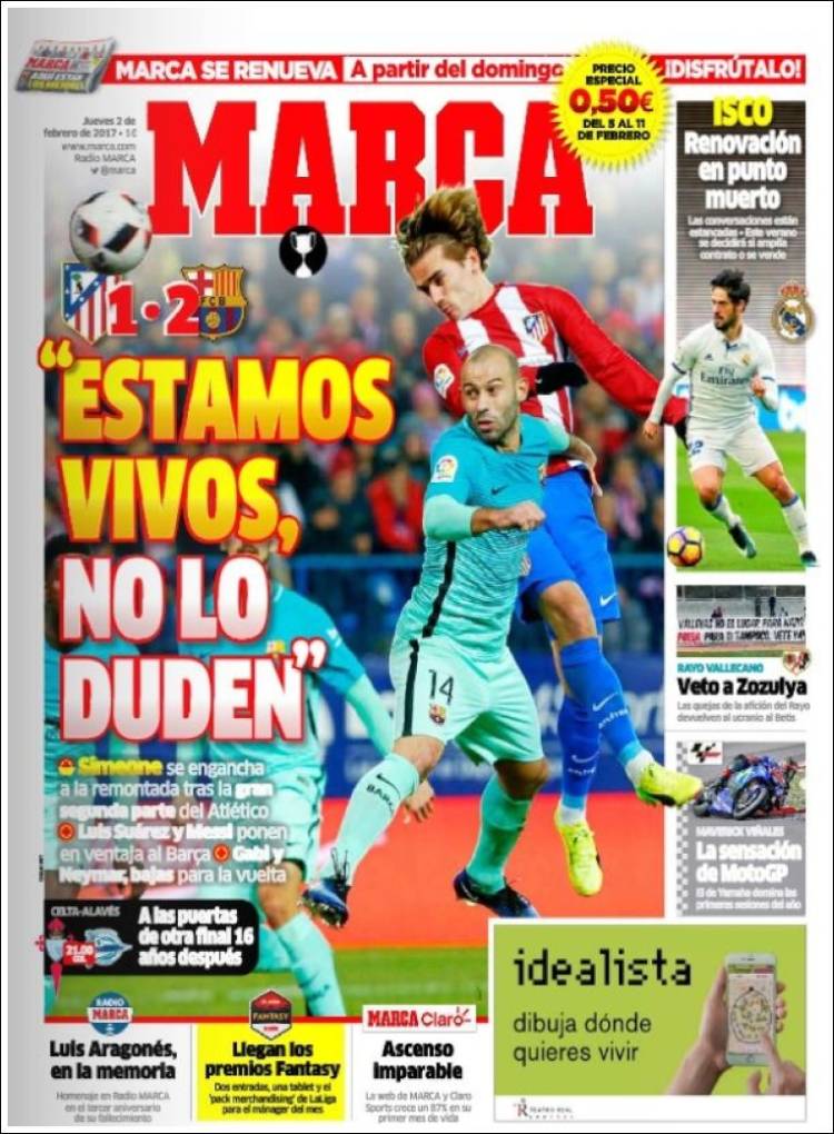 Bueno ya no hay duda, los panfletos madrileños as y marca, son catalanes ya lo sabiamos as-sport y su director REBAÑO , MUCHA BILIS Y MAS BABA Q LOS CARACOLES. pero tenemos q nombrar a marca tambien, a veis leido algo en alguno de ellos del penalti tremendo de los ùltimos minutos de Macherano, hay orden de q a este no se le pite nunca penalti tiene bula (si no no se comprende, q con la cantidad de ellos q hace no le piten ninguno ) o los arbitros estan ciegos para ese jugador, pero si nombran bien el q le hicieron a Suarez, claro ese es de su cuadrilla.