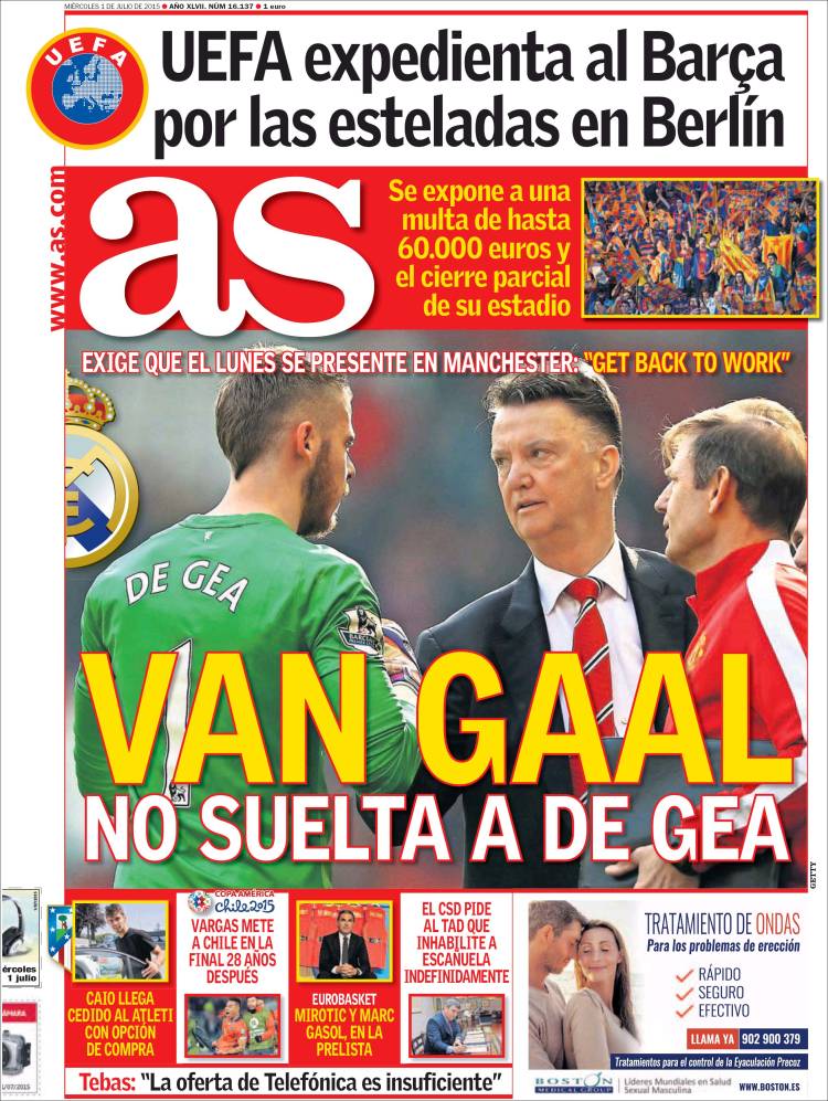 Dejadez aparte, reconocemos a As que sea el único periódico deportivo que hoy informa en portada del expediente que ha abierto la UEFA al Barcelona por mostrar símbolos de carácter político (en forma de esteladas y cánticos de reivindicación independentista) en la pasada final de Champions. Se podría decir que es un exceso de la UEFA esto de querer fuera de los estadios cualquier tipo de señal política, y reconocemos que el asunto da para debate mesurado y matizable. Pero también se puede decir que el Barcelona sigue acumulando sanciones y problemas judiciales que, como poco, podrían hacernos dudar de la imagen impoluta y angelical que pretende vender el modelo de més que un club y que no pocos compran sin reservas. Una prueba de esa compra es que solo As informe en portada de esta apertura de expediente. Nos hacemos cargo de que en Sport y Mundo Deportivo anden ocupados analizando el corte de pelo del jugador francés de la Juventus llamado Paul, pero lo de Marca ya nos extraña más, aunque todos sabemos que en realidad no nos extraña casi nada.