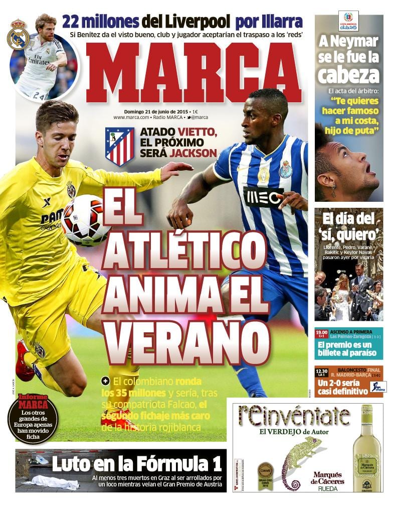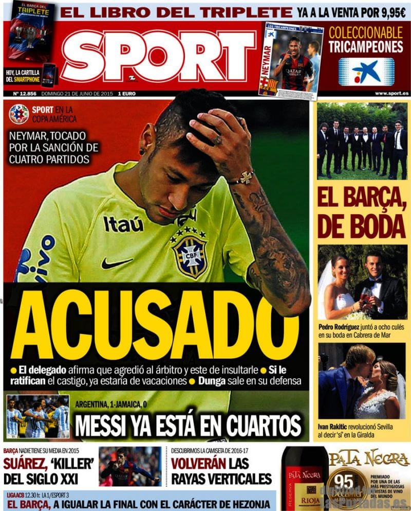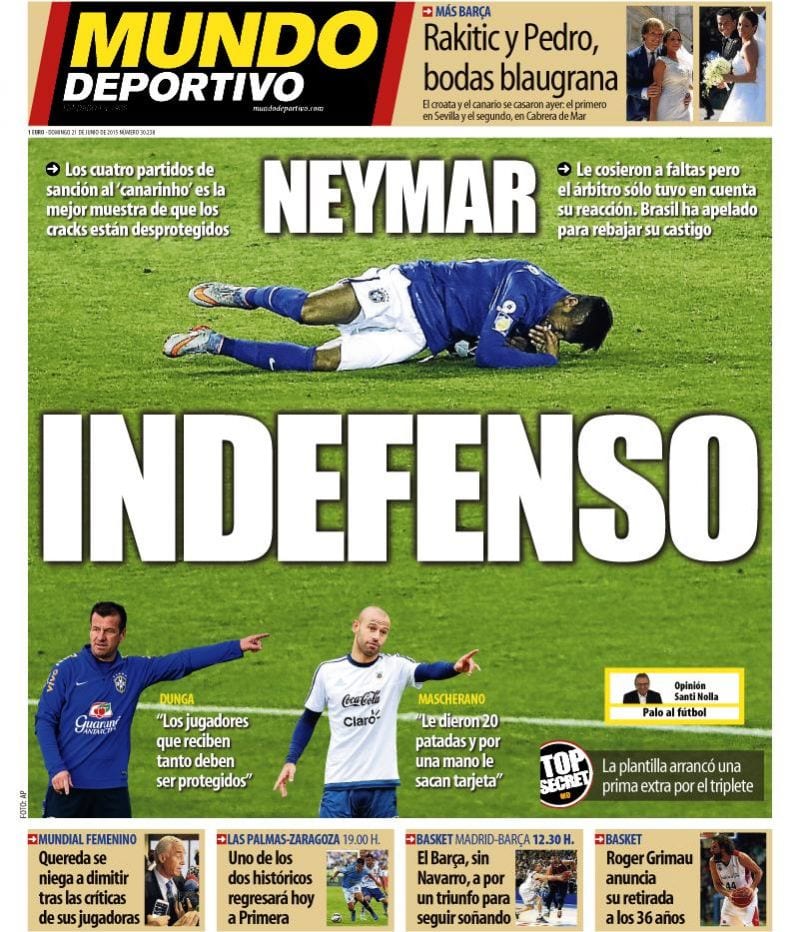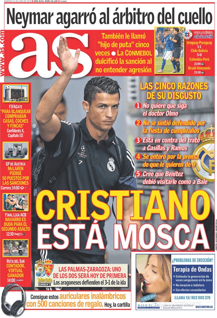 Tanto As como Marca se refieren en sus portadas a un detalle reciente de la vida de Neymar, quien parece que agarró a un árbitro del cuello para que pudiera escuchar sin interferencias algunas repetidas alusiones a su santa madre y una expresión de cierta megalomanía, donde también se deslizó la figura de la citada progenitora. Poca cosa. O al menos así parece si fuera cierto que "La CONMEBOL dulcificó la sanción al no entender agresión". Sí, léanlo dos veces o las que haga falta. La CONMEBOL pudo entender que coger a un árbitro por el cuello para llamarle "hijo de puta" cinco veces no es una agresión. Tipos duros estos de la CONMEBOL, gente forjada con las películas de Charles Bronson y Chuck Norris, personas de una entereza tal que ni las moscas cojoneras afectarían, individuos capaces de leer el As sin inmutarse, impertérritos, aun siendo madridistas.