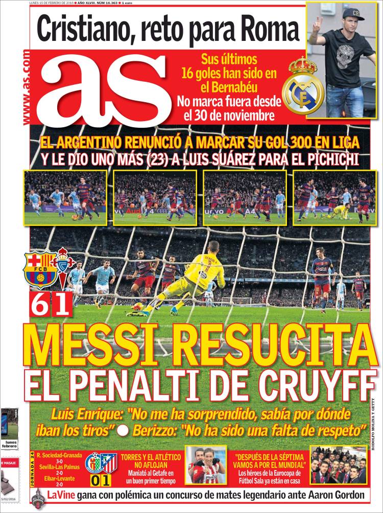 Lo gracioso (y lo reglamentario) hubiese sido que el árbitro ordenase repetir el penalti por haber entrado Suárez en el área antes del golpeo de Messi. Eso sí, no busquen ustedes imágenes de esta circunstancia en estos mismos periódicos de hoy. Tampoco busquen imágenes o comentarios de la mano de Piqué en su área con 1-1, ni de que Messi lanza la falta del 1-0 desde 8 metros más adelante del lugar de infracción. Obviamente, todo ello se debe a la lógica y comprensible falta de espacio derivada de la justa y necesaria sobreabundancia de loas y alabanzas.