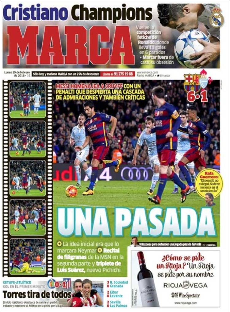 De verdad, no es envidia, a mí me da vergüenza ajena que sea considerado la octava maravilla un penalti en el que dos delanteros o tres se chulean de un portero sin defensa . Recuerdo una espaldiña de Cristiano y si no le costó el permiso de residencia y de trabajo fue porque es ciudadano de la UE y sin embargo que unos culerdos tiren un broma de penalti ante un rival goleado haya provocado un éxtasis casi colectivo me pasma.