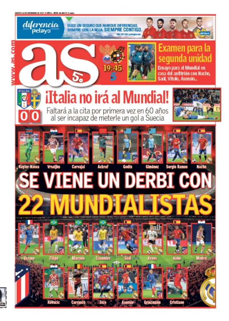 El caso es que la portada, de indudable inspiración Panini, nos descubre, entre profusión de cromos, banderitas, colorines y esa tipografía de elegancia garrafón marca de la casa, que es posible que el derbi del sábado lo jueguen veintidós mundialistas (y nosotros con estos pelos). A decir verdad, el Ouija se expresa con esa impronta tan suya de eterno adolescente más adicto al tuiter y al onanismo que a las aulas del instituto para anunciar que "se viene un derbi", empleando ese reflexivo que podría dar mucho juego si ese juego tuviera el menor interés, lo que no es el caso. De cualquier manera, lo que está claro que no se viene a la redacción del As es la gramática. Pero qué importa la limpieza en la expresión cuando lo expresado tiene tanta transcendencia y calado.