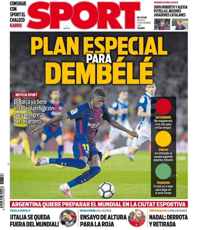La segunda noticia es que hay nada menos que un Plan Especial para Dembélé. En rigurosa primicia ("Noticia Sport", recalca el Sport por si alguien se le ocurre pensar que la noticia es del Frankfurter Allgemeine Zeitung), nos informa de que el Barcelona, seguramente después de múltiples reuniones y estudios, y tras haber contratado los servicios de alguna consultora de prestigio como McKinsey o Boston Consulting, ya tiene lista la planificación para el regreso del delantero. La planificación consiste, según nos aclara la propia portada en un loable intento de colmar nuestra insaciable curiosidad, en esperar a que se recupere de su lesión para incorporarle después paulatinamente al equipo y, finalmente, si todo transcurre según lo previsto en ese plan tan concienzudamente trazado, confiar en que pueda jugar de titular. Como podéis comprobar, queridos galernautas, es un plan tan especial que a nadie se le había ocurrido anteriormente. Ha tenido que ser de nuevo La Masía la que rompa los moldes del fútbol y el Sport el que nos abra los ojos con esta noticia que marca un antes y un después en la historia mundial del periodismo.