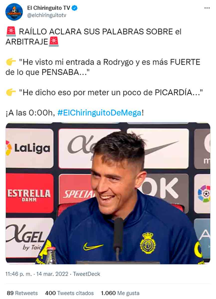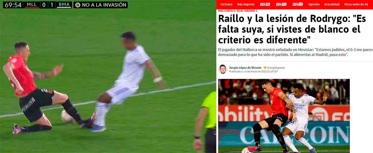 La permisividad de Sánchez Martínez con los futbolistas del Mallorca propició que estos elevasen el tono de sus entradas hasta que una de ellas, la de Raíllo a Rodrygo, lesionó a un futbolista del Real Madrid. Los hechos son irrefutables, el futbolista del Mallorca golpea de manera criminal al brasileño y este ha de ser retirado en volandas porque no pudo siquiera abandonar el terreno de juego por su propio pie. Hizo falta una acción de esta gravedad para que el colegiado mostrase tarjeta amarilla. Sin embargo, el agresor, Raíllo, realizó las siguientes declaraciones: