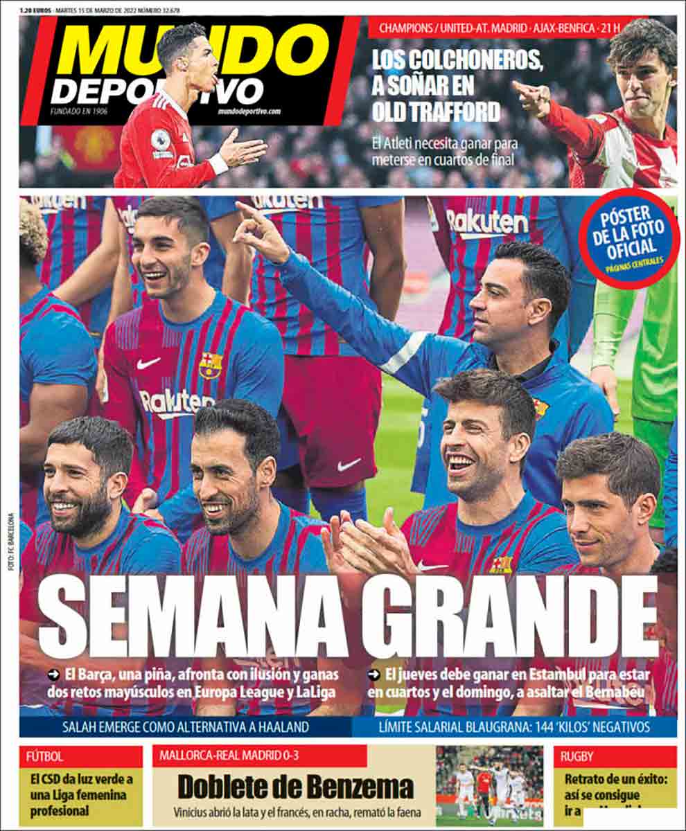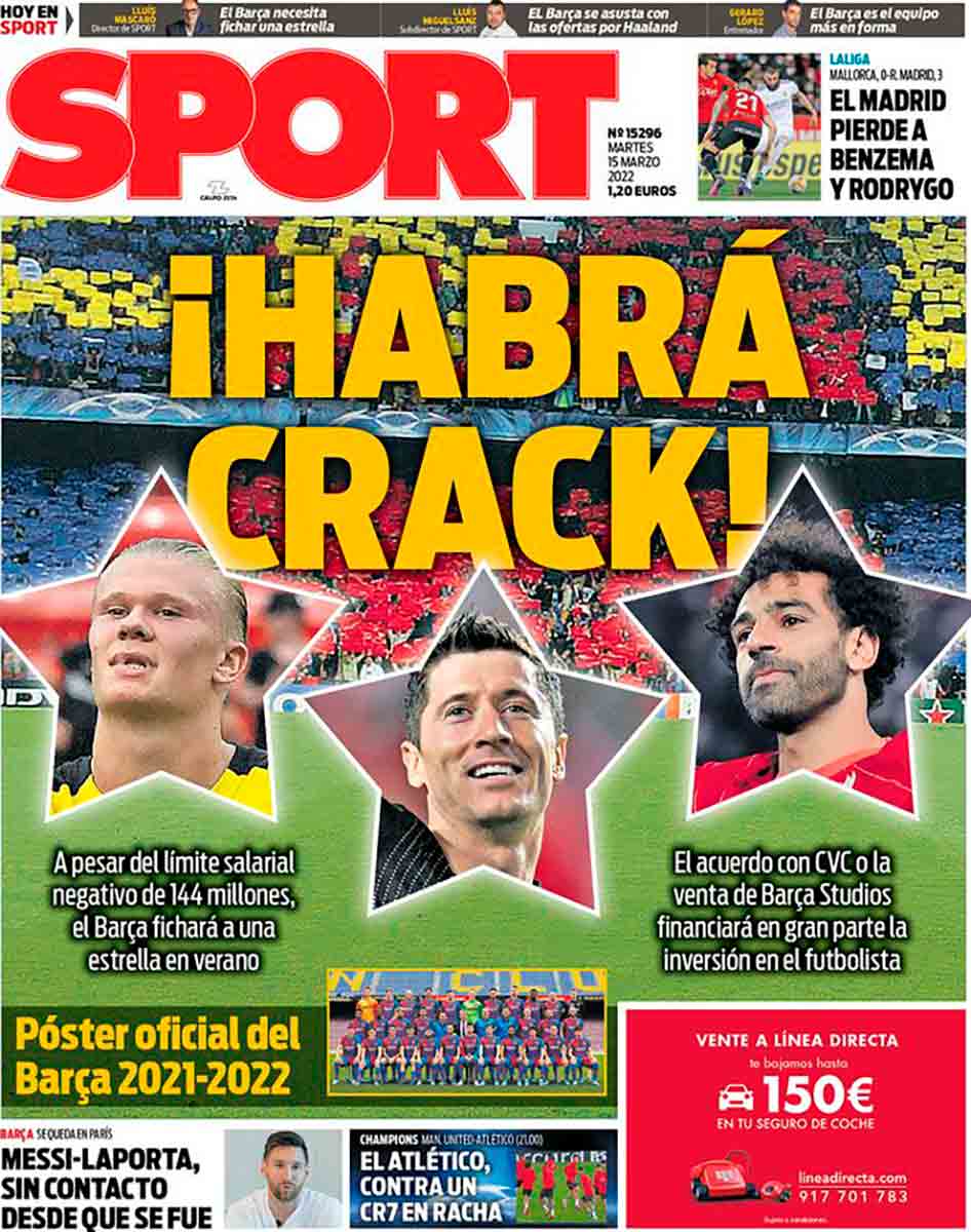 Para Sport no aplica problema económico culé alguno y asegura en su portada que a pesar del límite salarial negativo de 144 millones, el Barça fichará a una estrella en verano. Ilustra su afirmación con fotografías de Erling Haaland, Lewandowski y Salah. ¿Y por qué a Sport no le preocupa el cumplimiento del Fair Play económico? Porque la experiencia le lleva a pensar que el Barça está por encima de él y finalmente encontrarán la manera para que pueda fichar lo que quiera. No se esconden.