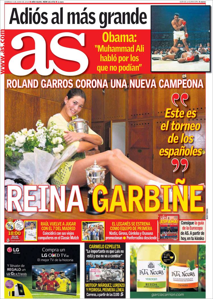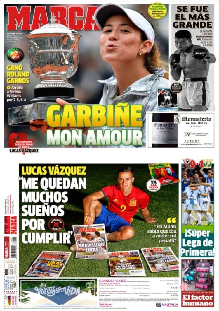 Sin pretensión de opocar lo anterior, nos gusta la presencia de Lucas Vázquez en la portada de Marca, aunque por supuesto no viene tanto a cuento como la imagen de Garbiñe o la presencia totémica de Ali. Tal vez haya cedido aquí Marca a eso que decíamos del mercado al dividir su portada en dos (ya práctica habitual del medio madrileño) para dar cabida al hoy secundario fútbol. Pero qué le vamos a hacer si nos gusta que aparezca Lucas Vázquez en nuestras vidas, por cualquier esquina, resquicio o pretexto que sea menester. Si aparece Lucas Vázquez es que todo puede salir bien. Si Lucas V está presente, la ilusión casi infantil, el despreocupado empuje y el talento nos dibujan una sonrisa mientras el balón de la Undécima sigue dando vueltas sobre sí mismo en nuestro dedo camino del mejor penalti del mundo.