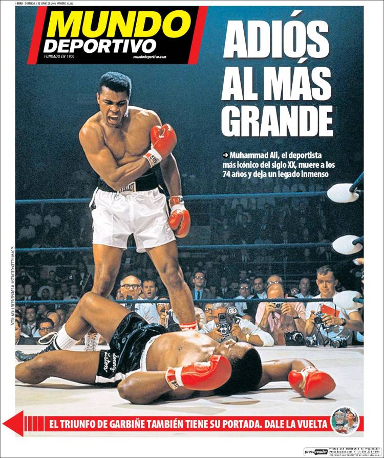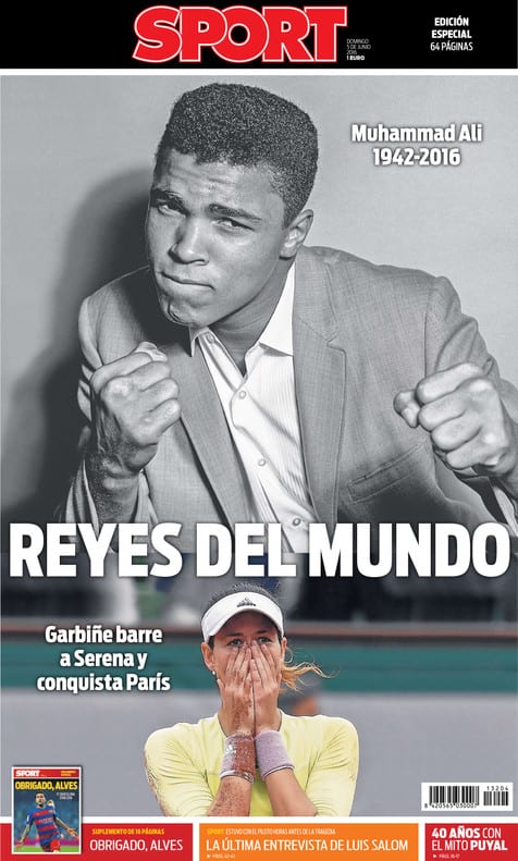 Dos son los motivos destacados en las portadas de hoy: uno, pura vida en acción; el otro, el fallecimiento de un ilustre que justamente nos recuerda cuánto cabe en una vida. Tal vez, queridos galernautas, no sea demasiado larga la vida, pero ejemplos como el de Ali confirman que, con ahínco y talento, lo que no es largo bien puede expandirse a lo ancho y llenar un espacio enorme, ese que ahora deja vacante la muerte del boxeador para que sea ocupado definitivamente por la eterna vida del mito, en perfecto estado de salud. La velocidad de pies de Ali sigue tan en forma como el primer día, su carácter de líder hasta espiritual y político en unos Estados Unidos forzados a escuchar lo que no querían sigue siendo un ejemplo de arrojo, y su figura icónica ya forma parte de la cultura pop de una época prodigiosa que no empezó en Kinshasa, pero que allí tuvo una de sus referencias ineludibles. Descanse en paz el hombre y larga vida a su ejemplo.