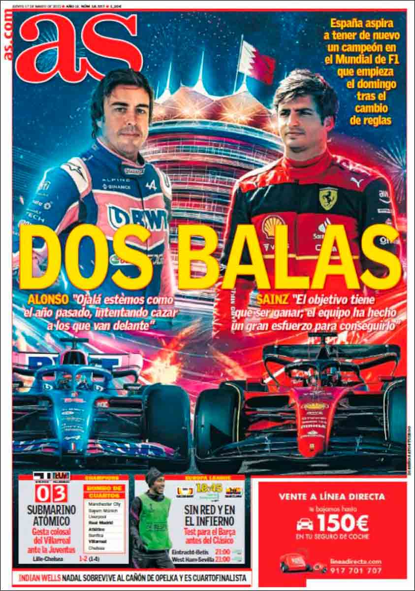 As se decanta por la Fórmula 1, dedica su frontispicio a Fernando Alonso y a Carlos Sainz y titula: “Dos Balas”. ¿Sobre Broadway? Nos preguntamos nosotros, y acto seguido nos entran ganas de ver de nuevo el film de Woody Allen. Buen plan para esta tarde a eso de las 18:45. Bastante mejor que ver un telefilm sobre prisiones turcas.