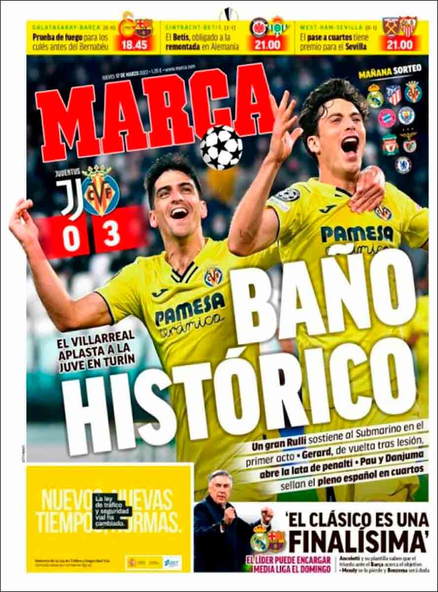 Marca titula “Baño histórico” para referirse a la victoria por 0-3 que el Villarreal endosó a la Juventus en Turín y que supuso la clasificación del cuadro amarillo para cuartos de final de la Champions League. Más allá de filias y fobias, de bolsas con pines y llaveros, de comportamientos más o menos alejados de la educación, la gesta del Villarreal es importante y por tal motivo le damos la enhorabuena. En caso de que en la próxima ronda Albiol se dedique a derribar rivales con el codo, como a Vinícius, será interesante ver si se la juega mucho o no en Europa.