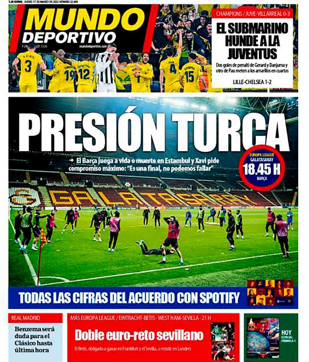 Mundo Deportivo también utiliza una sinécdoque para referirse a la victoria del Villarreal: “El submarino hunde a la Juventus”. Pero lo que nos llama la atención es que más de un año después del suceso haga referencia al abandono de Heurtel en Estambul con un titular como “Presión turca”, que sin duda fue a la que sometió al base francés al desentenderse de él en Turquía en plena pandemia.