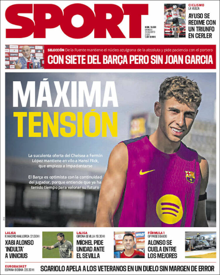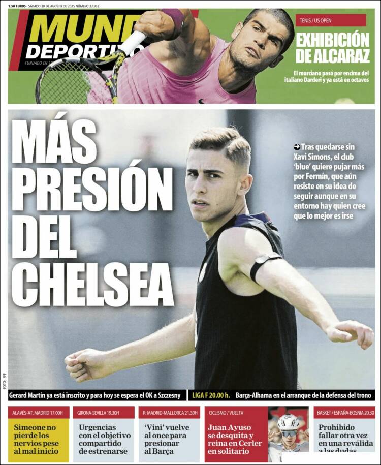 Mañana os lo terminamos de explicar. Sabed también que Lucas Vàzquez ha fichado por el Leverkusen (toda la suerte, ídolo) y que el club cliente de Negreira anda a vueltas con un presunto interés del Chelsea en Fermín en este final de mercado. Os lo cuenta la prensa cataculé, con cuyas apasionantes portadas os dejamos por hoy, no sin antes recordaros lo importante, o sea, que a las 21:30 juegan los de Xabi.