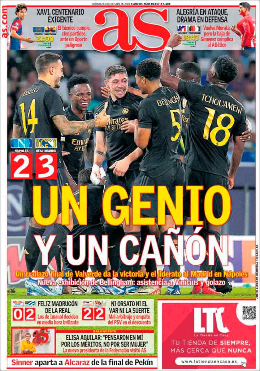 As también titula hoy con motivos de infantería: “Un genio y un cañón”. El cañón es Fede y el genio entendemos que Bellingham, a quien de hecho, con esas facciones exóticas y esa sonrisa radiante, no es difícil imaginar brotando vaporosamente de una lámpara frotada antes por Florentino.