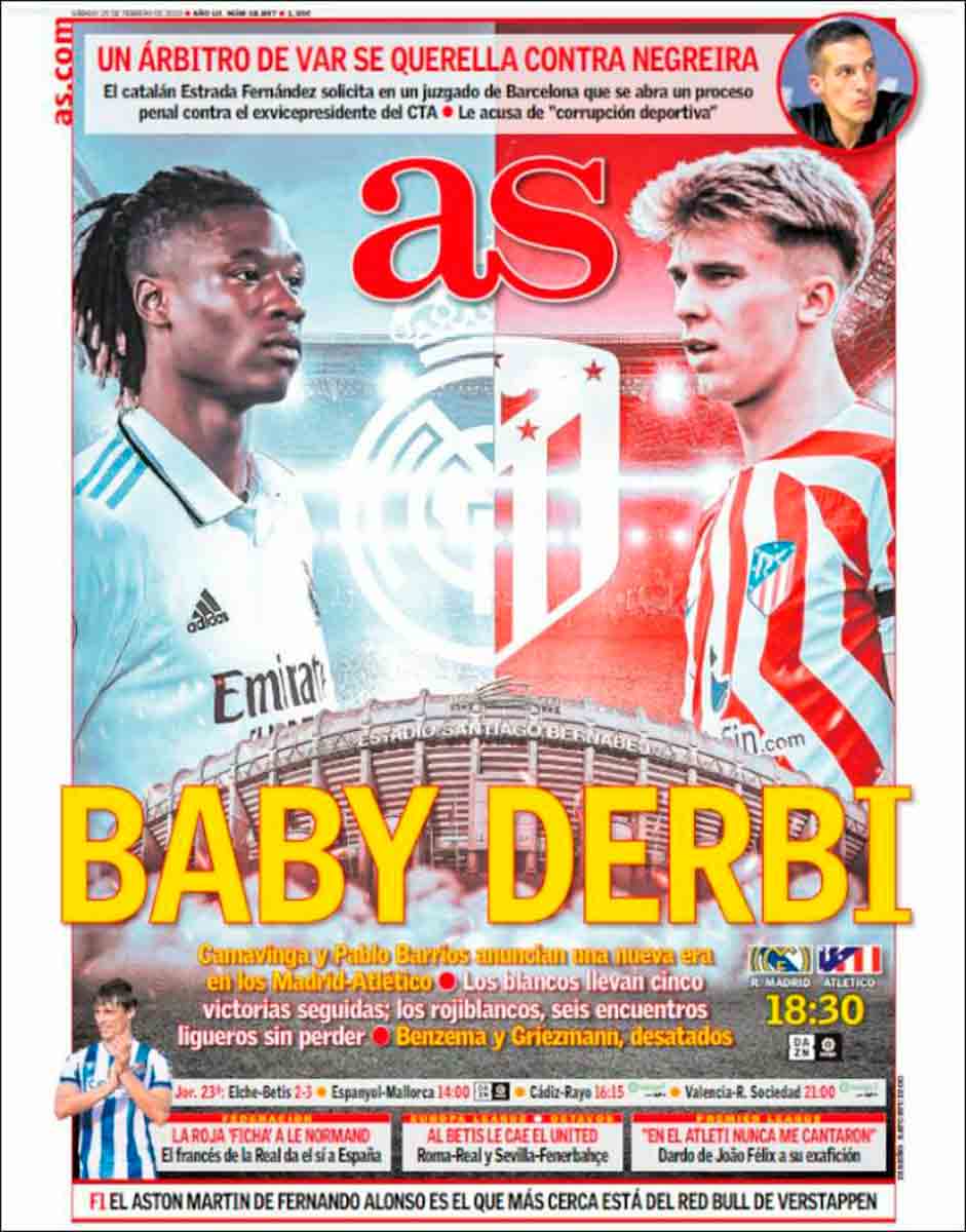 El diario As sitúa frente a frente a Camavinga y a Pablo Barrios como apuestas del futuro de los Madrid-Atleti. El joven atlético parece una estupenda promesa de futbolista, de momento sin la prensa de los Gavi, Pedri, Fati que tanto gustan en los medios, pero nuestro Camavinga no es una apuesta de futuro, sino un jugador total de presente que ya ha sido importante en una final de Champions, otra de un Mundial, o que sentó cátedra sobre el medio campo en un estadio tan complicado como el de Anfield hace apenas unos días. Nuestro Eduardo no es canterano, pero lo queremos como si llevara aquí toda la vida. Pablo Barrios es otro canterano exmadridista que se pasó al bando rival, como Hermoso, Marcos Llorente, Reguilón o Saúl, qué le vamos a hacer. El Madrid pesca en los mejores caladeros del fútbol mundial, el Atleti se refuerza en La Fábrica y el Barça se asegura los éxitos en el CTA.