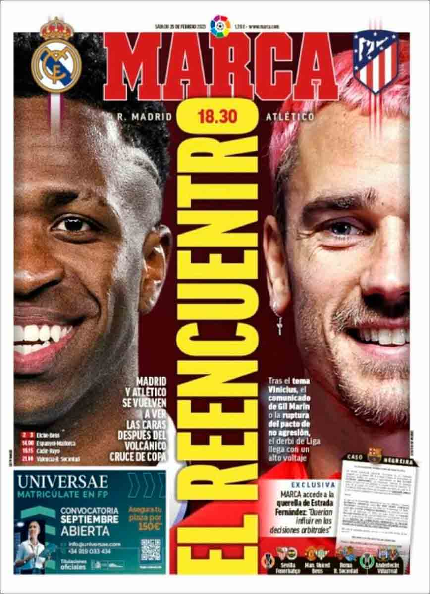 El diario Marca nos habla de un reencuentro entre Madrid y Atleti, y deja frases nada casuales, as usual. Recuerda el "volcánico" cruce de Copa de hace un mes, lo que denomina "el tema Vinícius" (ya saben que el problema siempre fue Vini y no el Frente Atlético) y remata con una mención al bochornoso comunicado de Gil Marín. Ya sabemos que a nuestros rivales de la capital les indigna más media jugada dudosa en un partido frente a los blancos que dos décadas de compra de favores al vicepresidente de los árbitros, pero habíamos dicho que no hablaríamos de corrupción, sino de fútbol, y ya nos estamos desviando del camino. Vini y ese señor de pelo de color indefinible llamado Griezmann (¿por qué no prohíbe el reglamento ese tinte, o cortes de pelo como el de Arturo Vidal?) sonríen en la foto. La sonrisa de Vini es amplia, como la de quien acaba de arar varios surcos cipotudos en uno de los campos míticos de Europa. La sonrisa de Pinkmann es estreñida, como la de aquel que presenció la jornada europea de fútbol desde el salón de su casa.