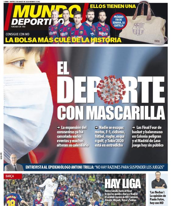 Esta sí que es la verdadera primera plana con la que hoy nos deleita Mundo Deportivo, por cuya redacción se ha pasado el coronavirus. No en este caso para causar estragos en forma de fiebres altas y problemas respiratorios, sino casi lo contrario, es decir, para brindar alivio editorial en forma de tema socorrido con el que sortear el temporal. No se nos malinterprete. Estamos seguros (ironía off) de que todo el mundo en Mundo Deportivo -valva la redundancia- preferiría que no existiese el coronavirus aunque ello implicase centrarse en la crisis culé. Sin embargo, ya que existe y nada se puede hacer al respecto, aprovechemos su presencia entre nosotros para sortear el marrón. Nadie en su sano juicio cree que, a idéntica situación mundial respecto a la epidemia, la portada hubiese sido para el coronavirus de haber ganado el Barça en el Bernabéu.