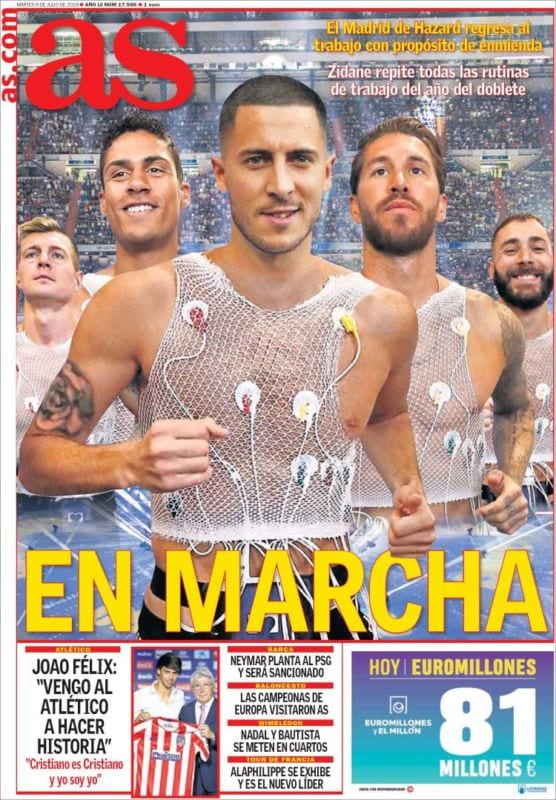Por lo demás, os dejamos las portadas del día, que son un verdadero coñazo. El Madrid, eso sí, ha vuelto al tajo, y esperamos ir contando cosas pronto sobre la evolución de los de Zidane en la pretemporada.