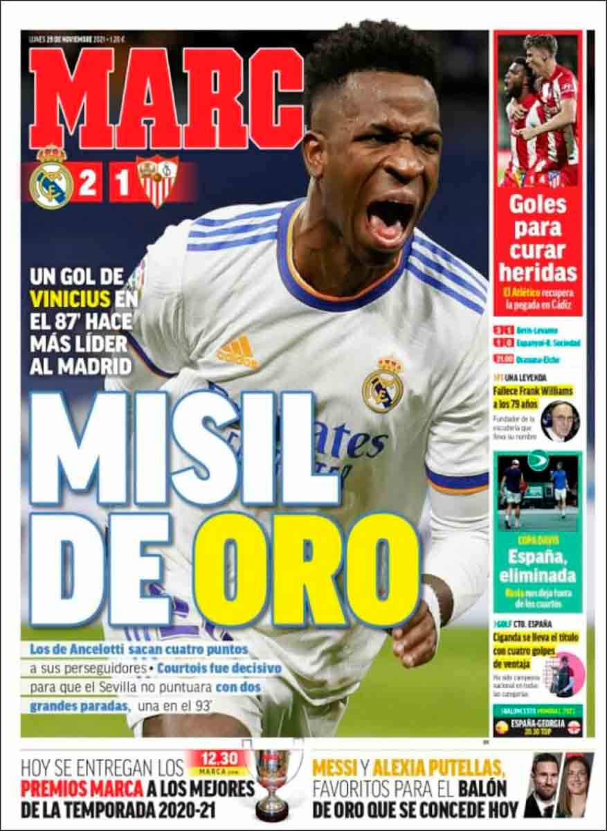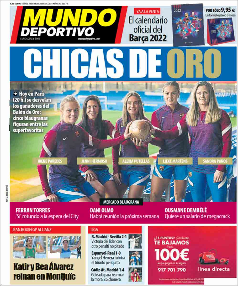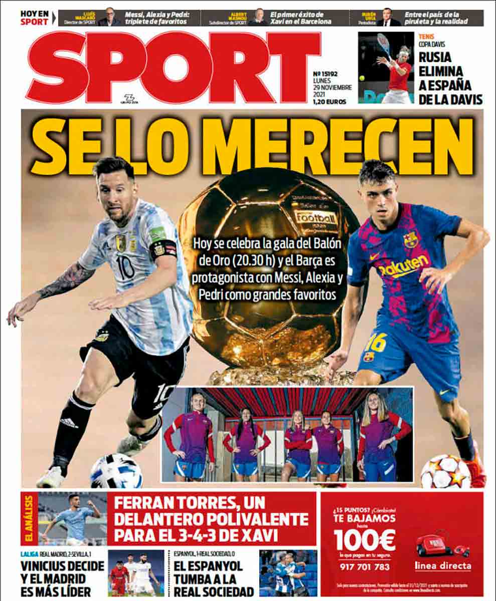 Entretanto, en Sport, la atención se vuelca en el Balón de Oro, pero fijaos qué interesante aproximación al tema. “Se lo merecen”, corean como en aquel viejo programa de Joe Rígoli (vosotros no habíais nacido), y por lo visto quienes se lo merecen son los suyos, o sea, los del Barça. Lo curiosa es que en esa categoría computan también a Messi, que ya no está en el Barça aunque parte del premio que (parece) va a ganar hoy se lo adjudique merced a los méritos (?) cosechados en su última temporada como culé. También aparece por ahí Pedri para cubrir la consabida cuota artificial de prestigio de la Masía, torta entronizada por vía rápida a falta de pan.