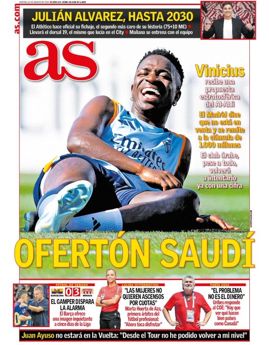 Todo esto, más o menos, es lo que cuenta la portada de As, que resulta sumamente inquietante. No hay un solo madridista en el mundo que quiera que Vinícius se marche, como no hay un solo ser humano que no entendiera lo tentador de la oferta para el jugador. Sí además llegara un trato por muchos (repetimos: muchos) cientos de millones para el club, cabe incluso preguntarse si no sería financieramente irresponsable rechazarlos. De manera que vamos a sufrir de aquí al final del verano, amigos. Si esto se concreta, el Madrid tendrá millones a espuertas para contratar a quien quiera, pero ¿quién puede acercarse a Vinícius?