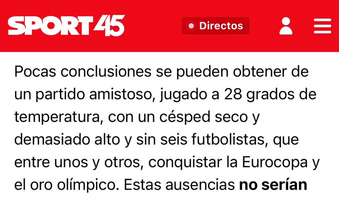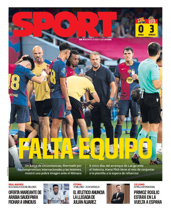 Sport es más radical analizando el fiasco y deja traslucir un innegable nerviosismo. "Falta equipo". Oh. Y ¿qué hacemos con eso? No es problema menor. Es sólo en su versión impresa donde cunde el alarmismo.  En su web, Sport hacía un análisis mucho más sosegado. Rayando lo risible, si se nos permite.
