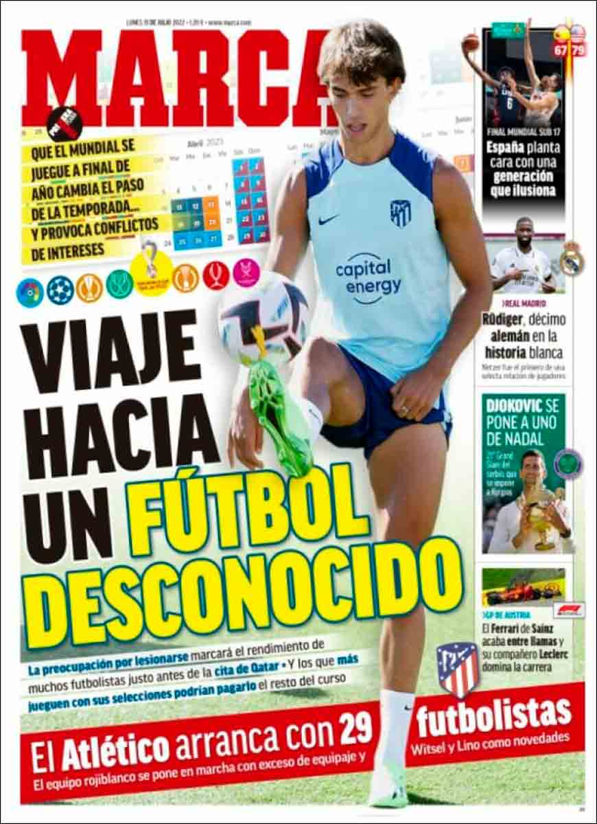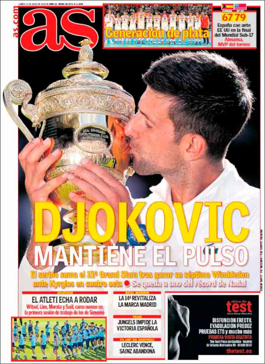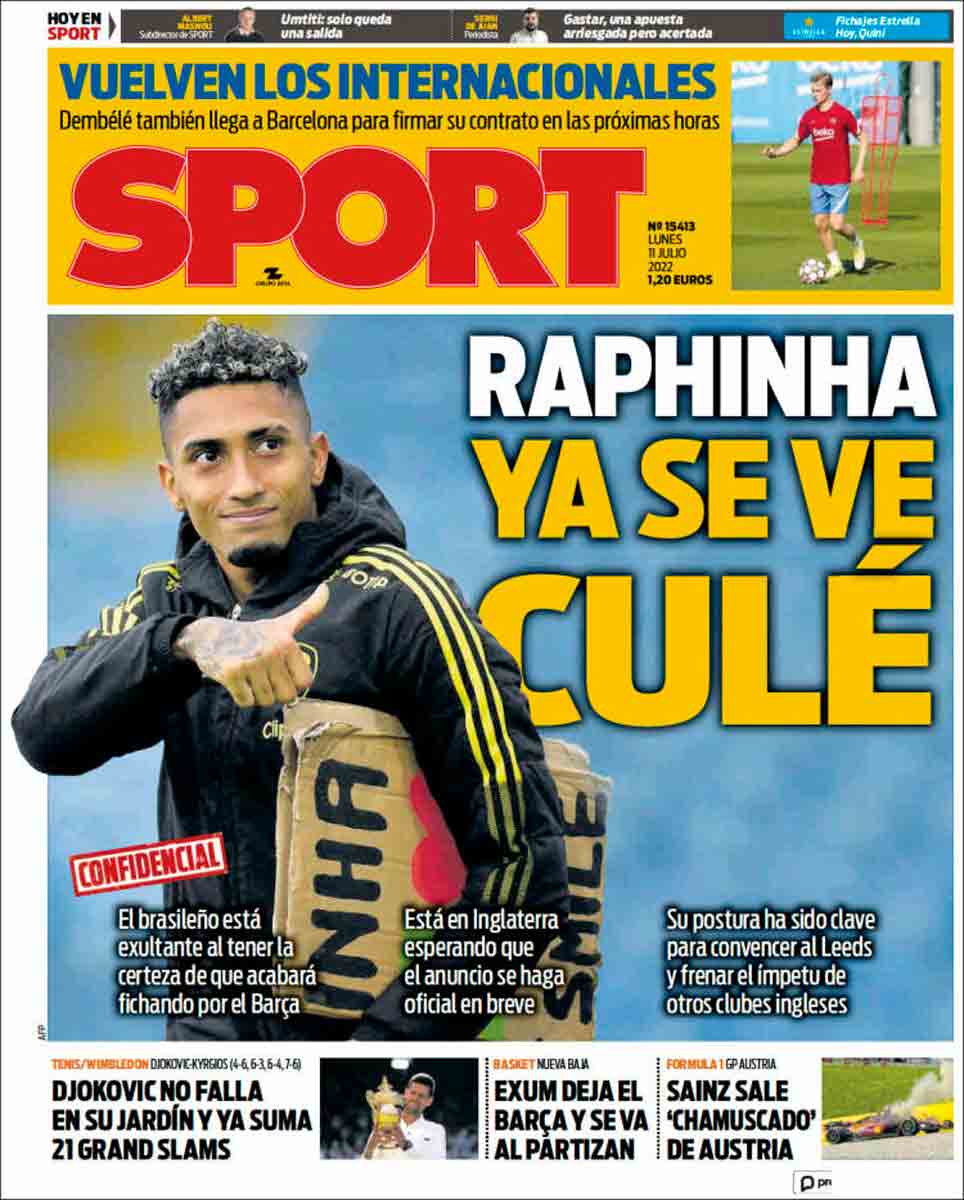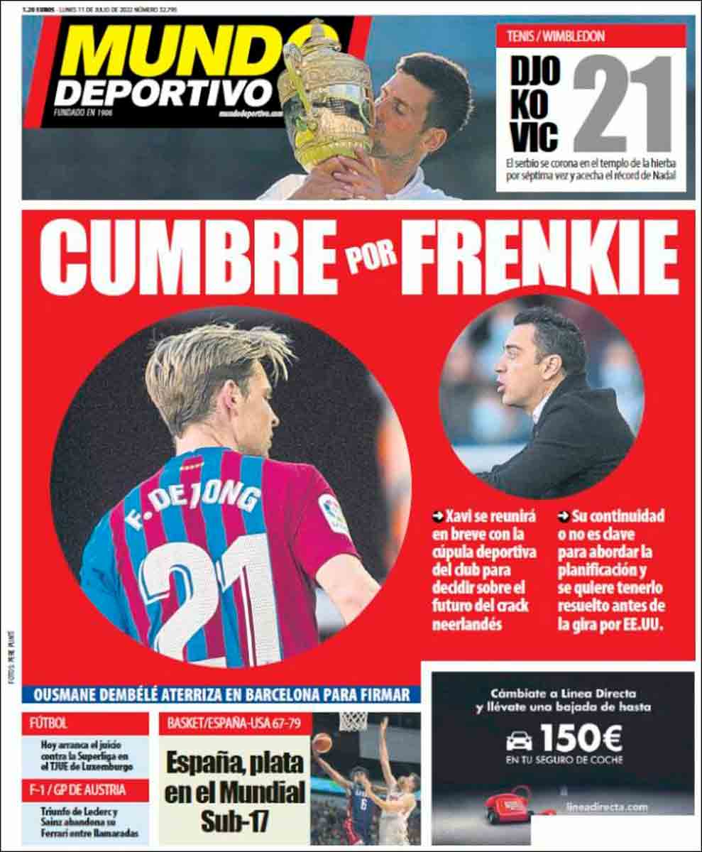 El resto de portadas no merecen mucho comentario. Djokovic ha ganado Wimbledon y el Barça quiere vender a su mejor jugador, Frenkie De Jong, para poder comprar a Raphinha, Lewandowski, Bernardo Silva y un señor de Burgo de Osma vestido de marrón. Para todo menos para pagar a sus desesperados acreedores, que las palancas son para el verano y no para saldar deudas.
