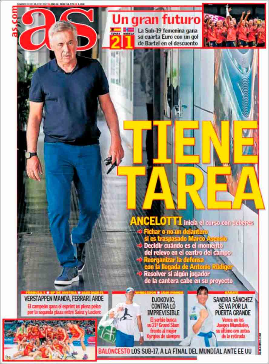 Dice As que Ancelotti tiene tarea por delante. Nos ha j... mayo con las flores, o julio con los bañadores. Claro que tiene tarea, pero una cosa es tenerla y otra cosa es este afán de As, y de la prensa en general, para que empecemos a preocuparnos ya. Todo mal a 9 de julio, amics. Esto ha de suponer un récord sin duda. ¿No podemos empezar a preocuparnos después de perder contra el Barça en Los Angeles, en el amistoso del día 24? O después de ganar contra el Barça, cuidado, que seguro que hay cosas por las que preocuparnos a pesar de la victoria. No, no estamos preparados para empezar a sufrir y a vinagrear tan pronto, cuando ni siquiera hemos tenido vacaciones aún sí es que finalmente las tenemos (La Galerna no vacaciona), cuando aún saboreamos las mieles de un año irrepetible.