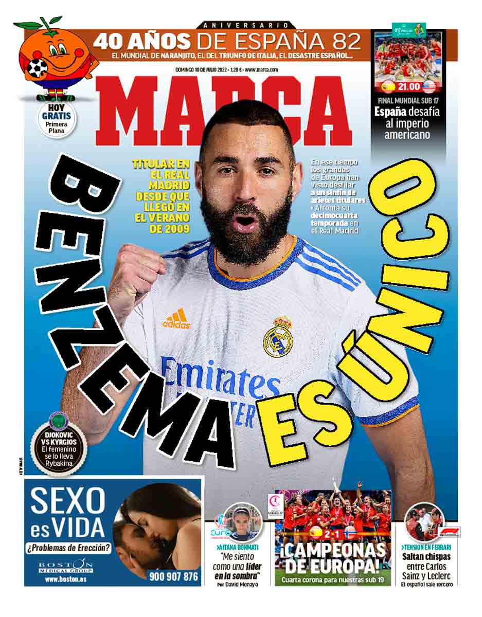 A 9 de julio de 2022, Marca se ha dado cuenta de que Benzema es único. Enhorabuena a Marca. A eso se le llama ir por delante. Una cosa es loar a un jugador consagrado como Pedri, cosa que está al alcance de cualquiera con dos ojos en la cara y dos dedos de frente, y otra tener el instinto y la sabiduría de predecir el refulgente futuro de nuevas estrellas prácticamente desconocidas como Benzema, y darle portadas. El mérito no está en ponderar a los ya famosos, sino en apoyar a los buenos precisamente cuando son jóvenes e inexpertos, e incluso justamente cuando las cosas no les van muy bien.