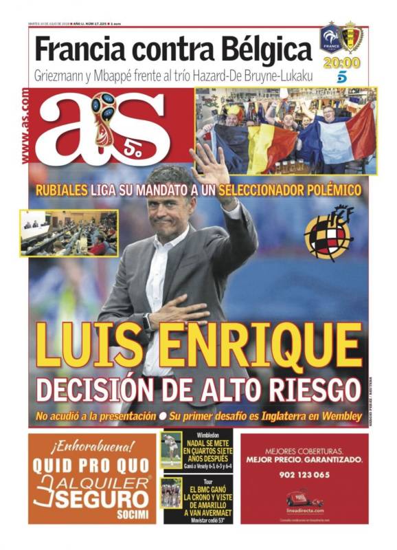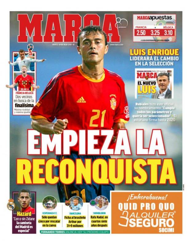 En las portadas, mientras tanto, división entre los que dan la bienvenida a Luis Enrique -prensa madrileña- y los que van directamente al mercadillo en busca de rumores y nuevos refuerzos -prensa catalana-. Dice 'Sport' que el tapado es Hazard. Lo hace justo después de que el belga se haya dejado querer por el Real Madrid. Veremos cómo acaba todo, pero no sería el primer jugador que acaba de blanco tras ser 'tocado' por el diario cataculé.