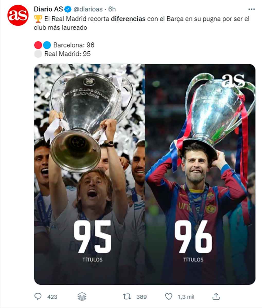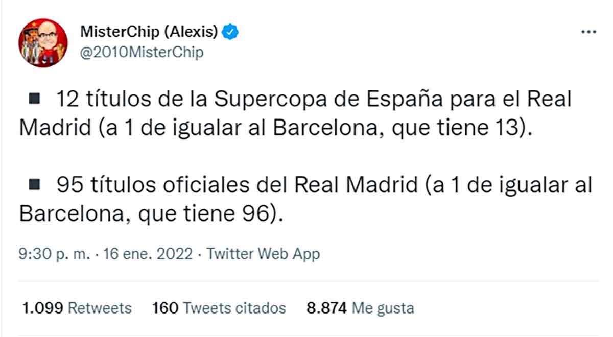 - Mister Chip, quien no tardó ni una hora en publicar que el Madrid seguía estando por detrás del Fútbol Club Barcelona en títulos totales y en Supercopas de España. La noticia no era el título, sino que el Barça es más.