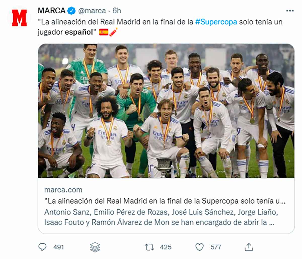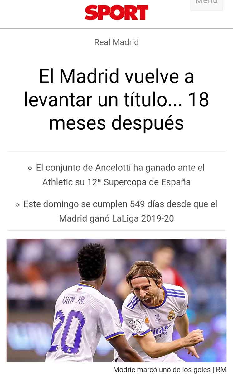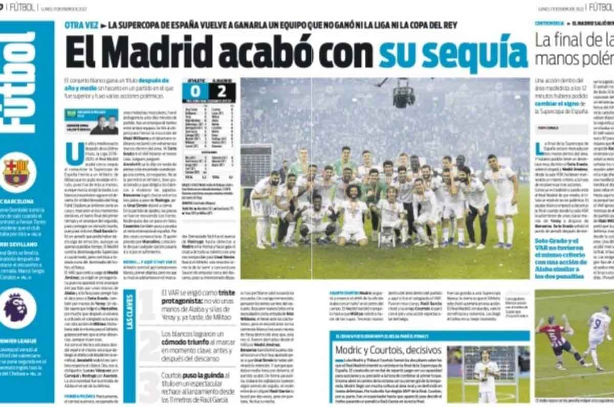 - Marca: que saca como dato negativo la casi total ausencia de jugadores españoles en las filas de los nuestros (se ve que a Carletto no le apetecía poner a Carvajal ni a Asensio, pero es que además nos importa más bien poco este dato). Se les ve tristes en la redacción, especialmente en la pluma de José Vicente Hernáez, el cual publicó que El Real Madrid pecó de soberbia. Con un par.