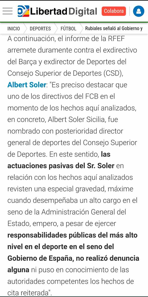 Y fijaos la dureza empleada por Rubi para poner en negro sobre blanco la siniestra y vital influencia en el BarçaGate del maquiavélico Albert Soler, el hombre bisagra, a ratos pseudoministro de Deportes, a ratos directivo culé, que tuvo los santísimos dídimos de abstenerse de ampliar el plazo de prescripción del delito del Barça cuando cambió la Ley del Deporte.