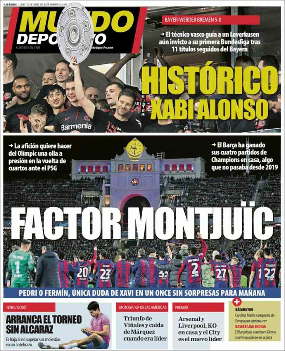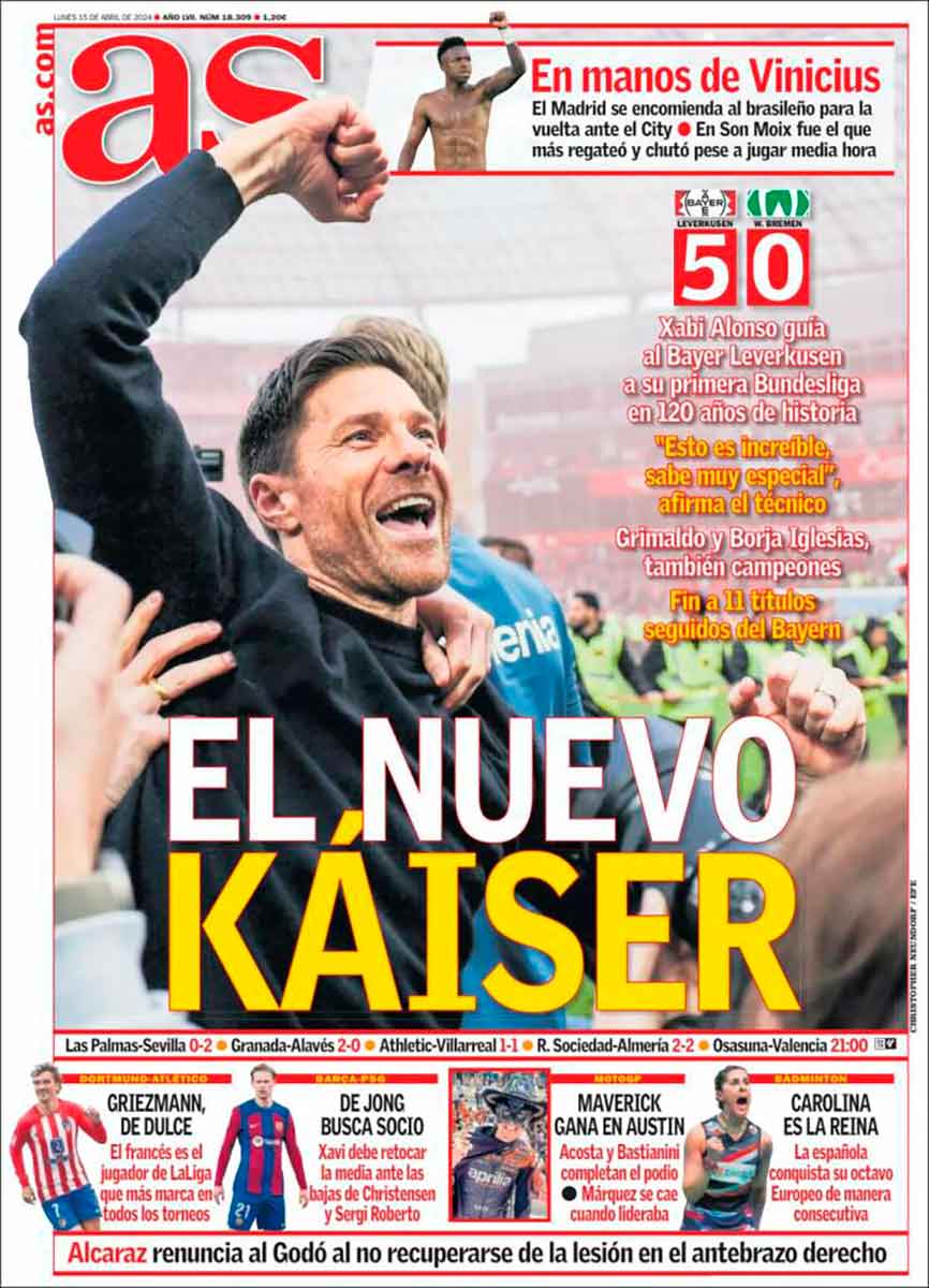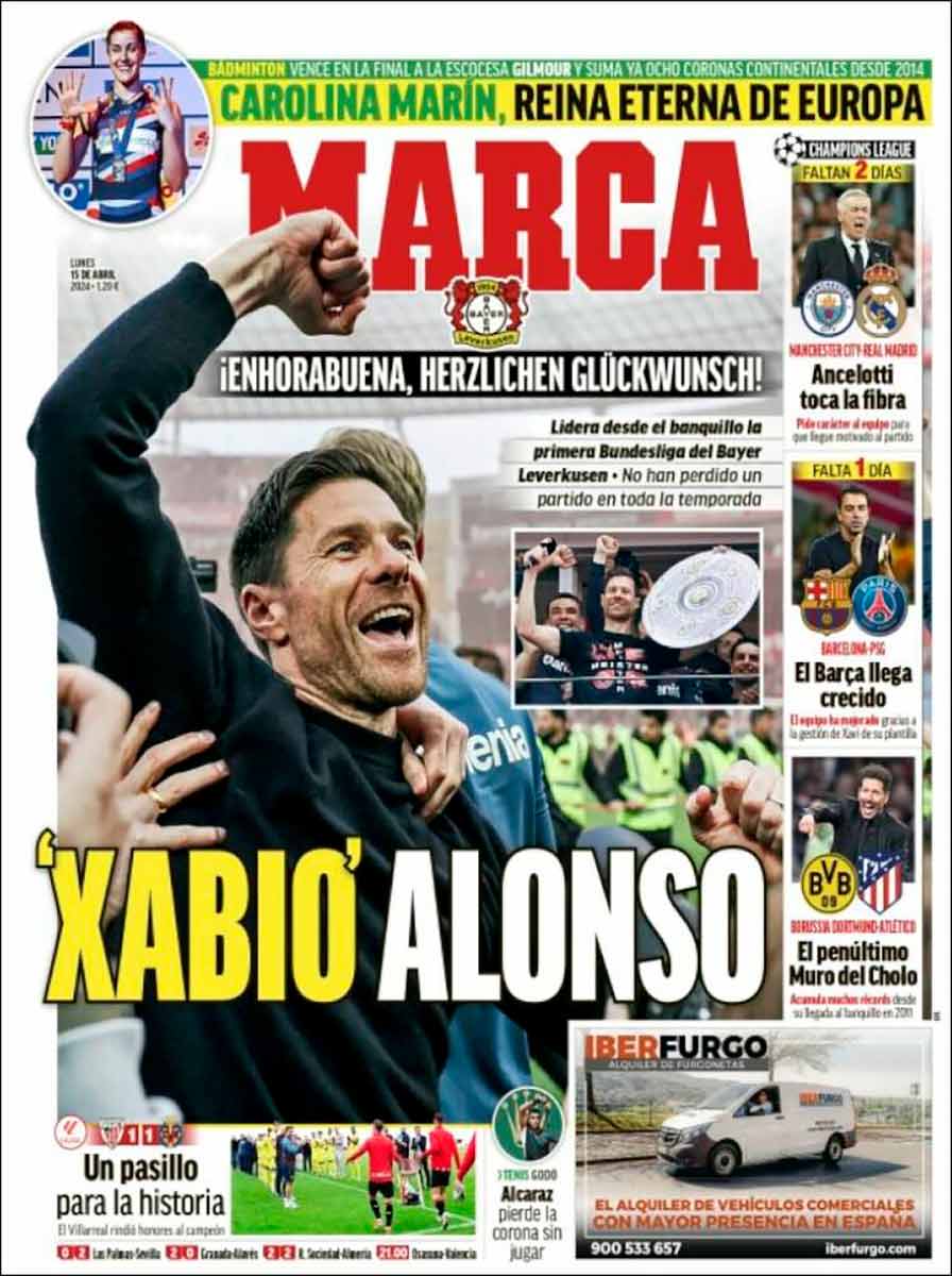 El gran protagonista de las portadas del día es Xabi Alonso. Os confesamos que estamos muy felices por él, casi eufóricos. Como técnico, ha conducido al Bayer Leverkusen a su primer título de la Bundesliga, que ha conquistado con brillantez inusitada y totalmente invicto hasta la fecha. Es una noticia que el mundo del fútbol acoge como el nacimiento de un nuevo grande de los banquillos, alguien que además fue ya muy grande sobre el césped, campeón entre otras muchas cosas de la Champions con Liverpool y Real Madrid.