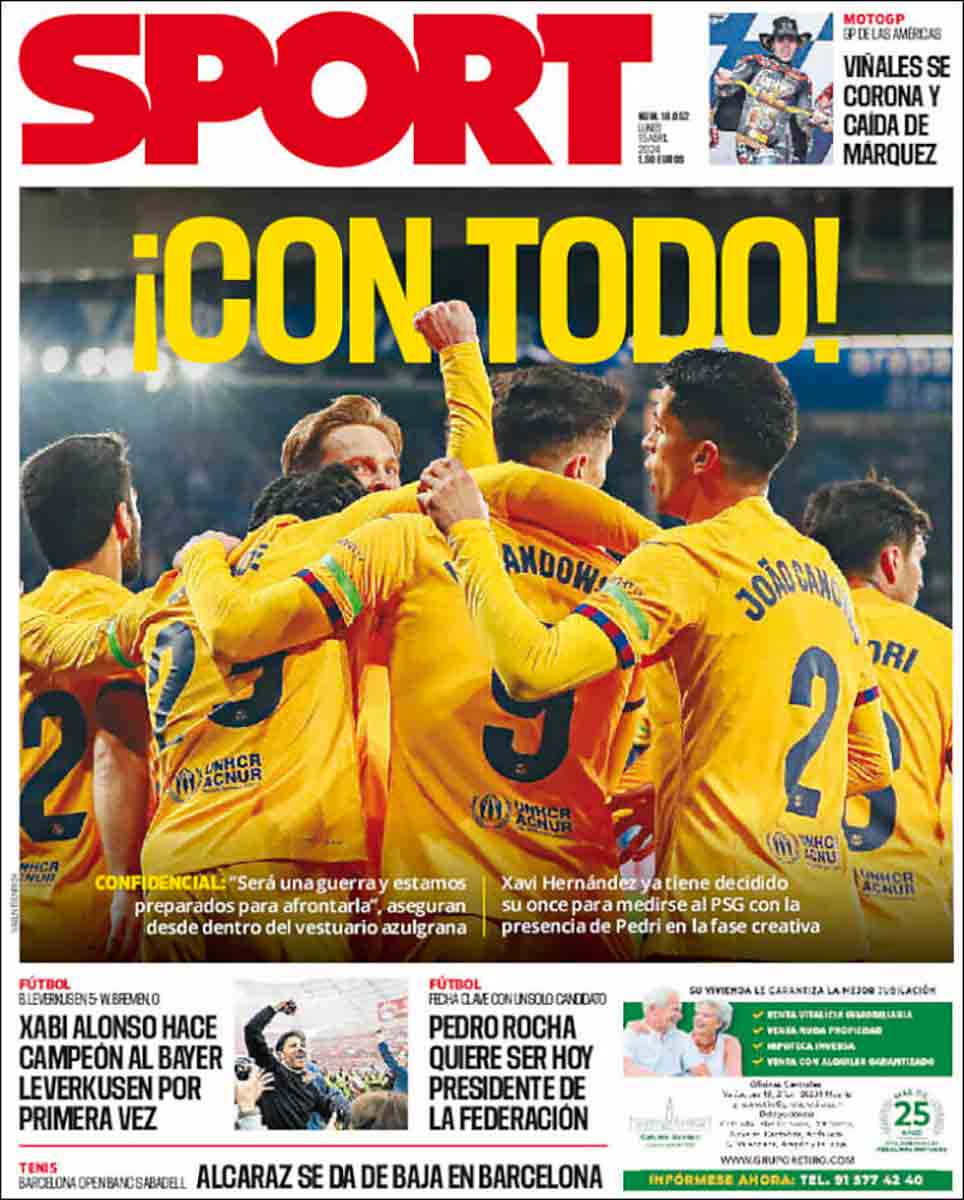 Os dejamos con las portadas cataculés, que andan ya nerviositas por la vuelta ante el PSG. Lo cierto es que lo tienen a huevo (o cigoto, como aprendimos en clase de ciencia) para entrar en semis, lo cual es un escenario inopinado y magnífico para quien —de no haber sido por Soler SICILIA, Rubiales y otros— debería haber entrado en Segunda División.