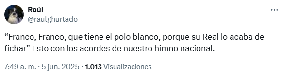 Acabe o no Franco en Madrid, lo que no estamos dispuestos es a hacer ninguna broma sobre el asunto. Pero, en caso de que finalmente firme por el club de Concha Espina, no estaría de más ir buscándole un cántico. En X hemos encontrado este que propone @raulghurtado: «”Franco, Franco, que tiene el polo blanco, porque su Real lo acaba de fichar”. Esto con los acordes de nuestro himno nacional».