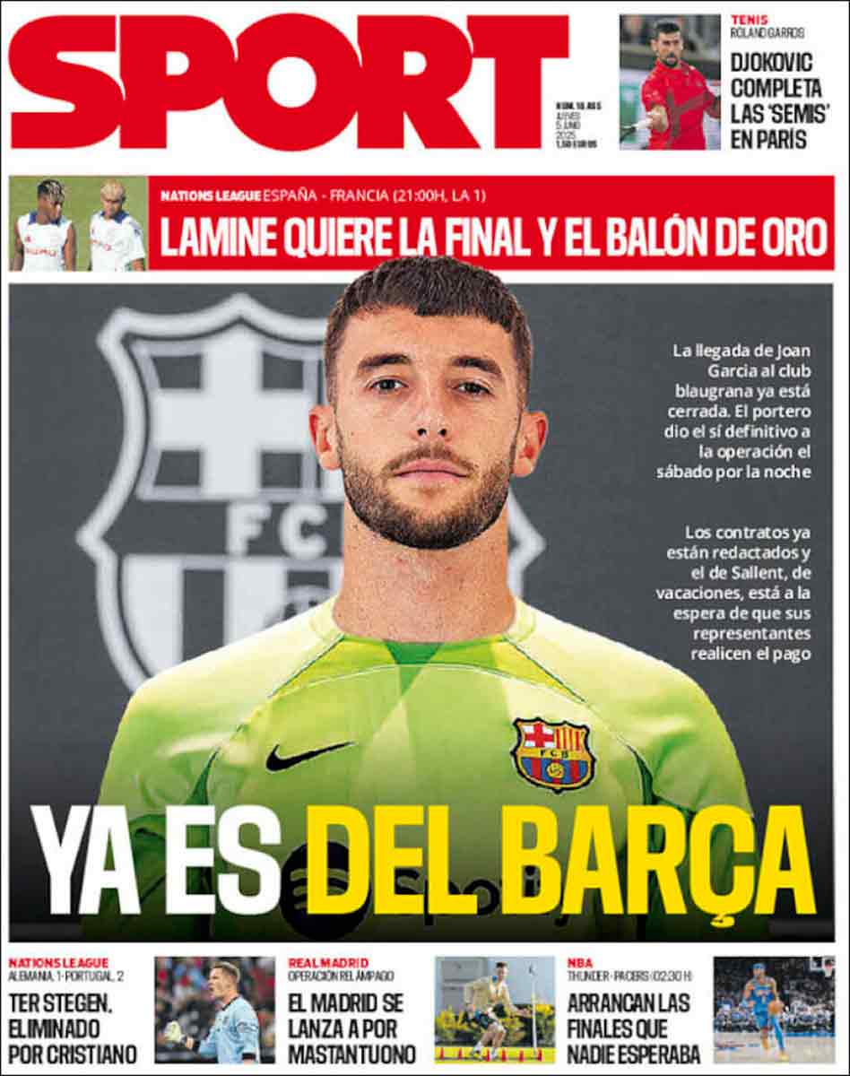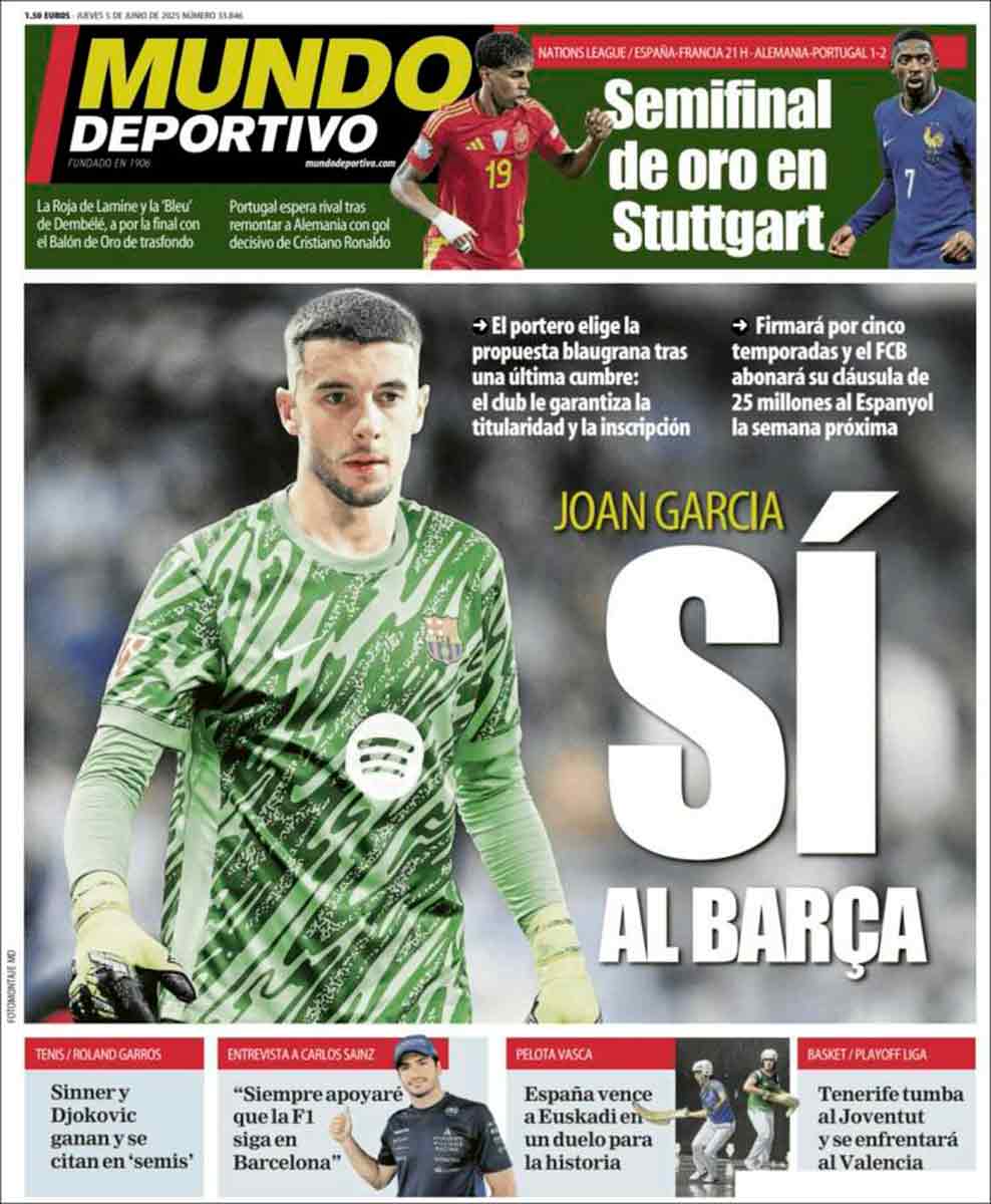En la prensa cataculé siguen a vueltas con el fichaje de Joan García. Repiten aquello de que el club le ha garantizado la inscripción, cosa que sabemos ocurrirá cumpla o no el FC Barcelona la normativa. Hoy ya le han vestido con la zamarra culé. Mundo Deportivo le ha colocado indumentaria militar y Sport ha utilizado el fondo de un carnet de socio del Barça.