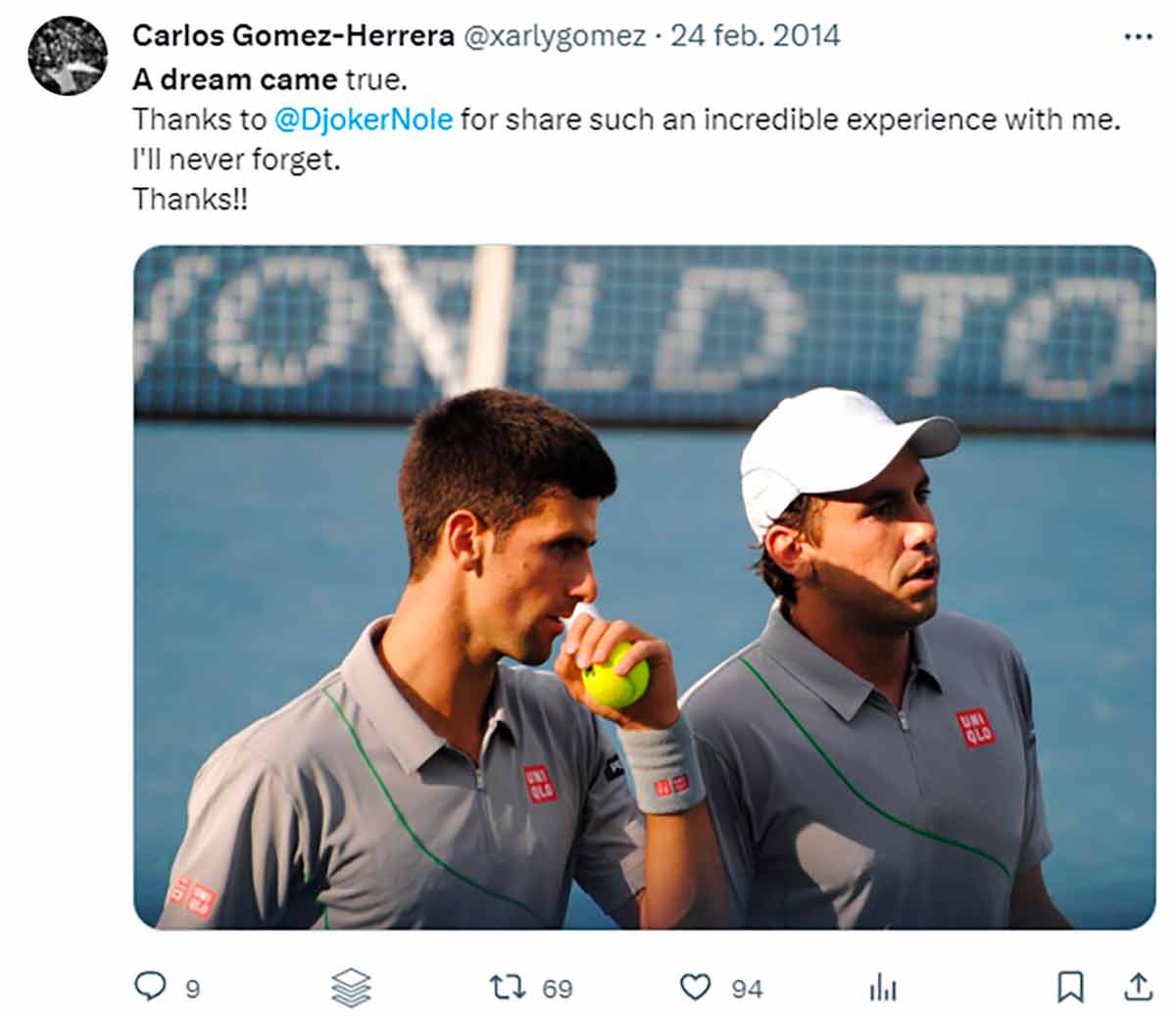 Así lo sintetizaba Xarly Gómez Herrera en su cuenta de Twitter —hoy 'X'—: @xarlygomez: "A dream came true. Thanks, @DjokerNole for share such an incredible experience with me. I'll never forget. Thanks !!". 'Un sueño convertido en realidad. Gracias @DjokerNole (avatar de Novak Djokovic en Twitter), por compartir semejante experiencia conmigo, algo que nunca olvidaré. Gracias!!'.