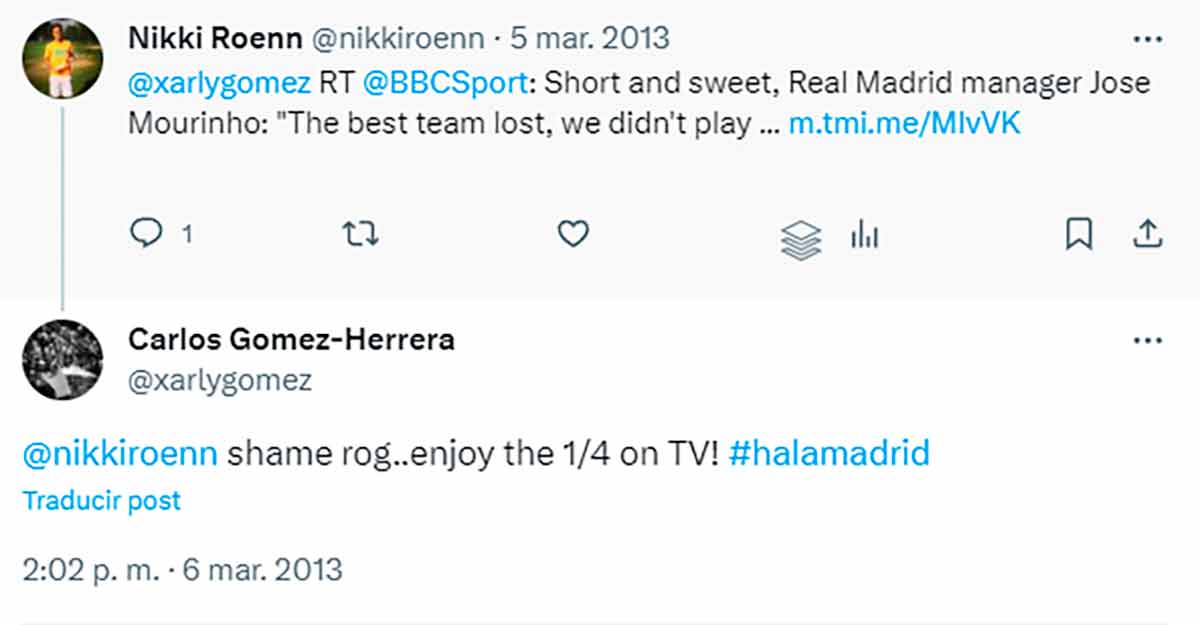Gómez Herrera replicó así a Roenn, entre bromas y veras: "Shame rog.. enjoy the 1/4 on TV! #halamadrid", 'Lástima, rog disfruta de los cuartos de final en TV! #halamadrid!'. Aquel Real Madrid superaría los cuartos de final de Champions ante el Galatasaray (3-0, 2-3), para acabar cayendo en semifinales bajo el empuje del mejor Borussia Dortmund de Jürgen Norbert Klopp, 4-1 para los 'borussers' en Dortmund e insuficiente 2-0 para el Real Madrid en Chamartín.