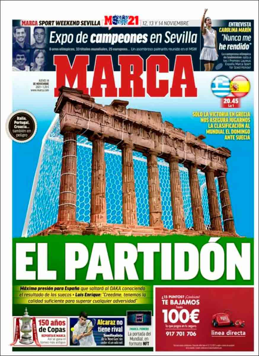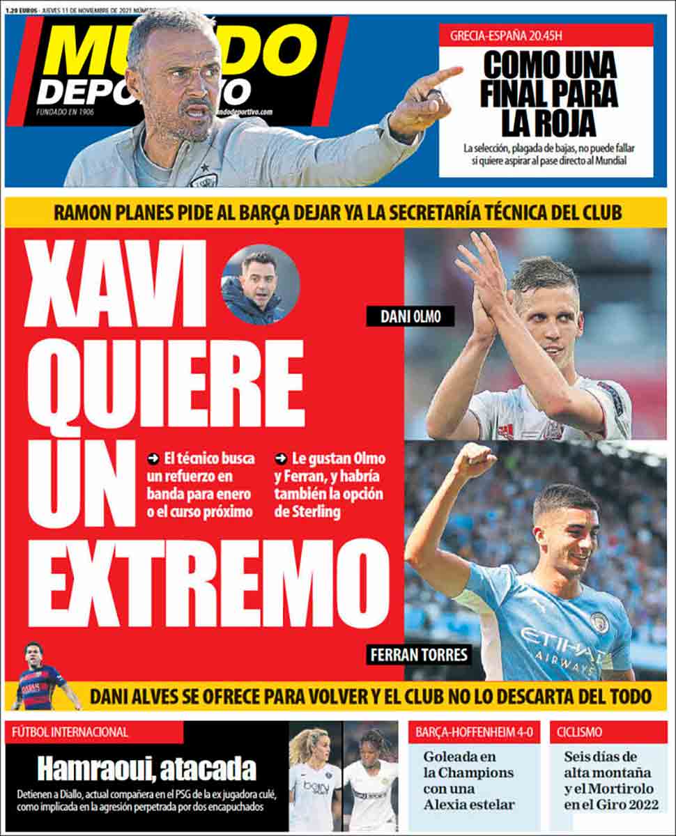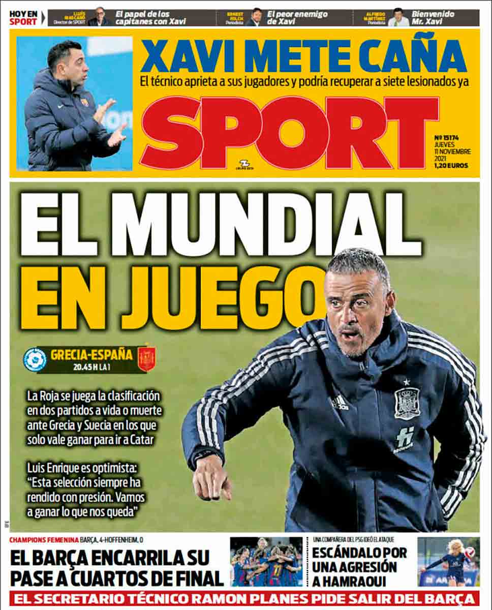 A pesar de lo excepcional del poder sanador de Xavi, Sport, como buen diario español, dedica su espacio principal a la selección nacional. Para el periódico acosador de familiares de árbitros en Benidorm es de vital importancia que los de Luis Enrique se clasifiquen para el mundial de Catar (tal vez su país ideal), por ello valoran tanto el partido de hoy frente a Grecia y el del domingo contra Suecia.